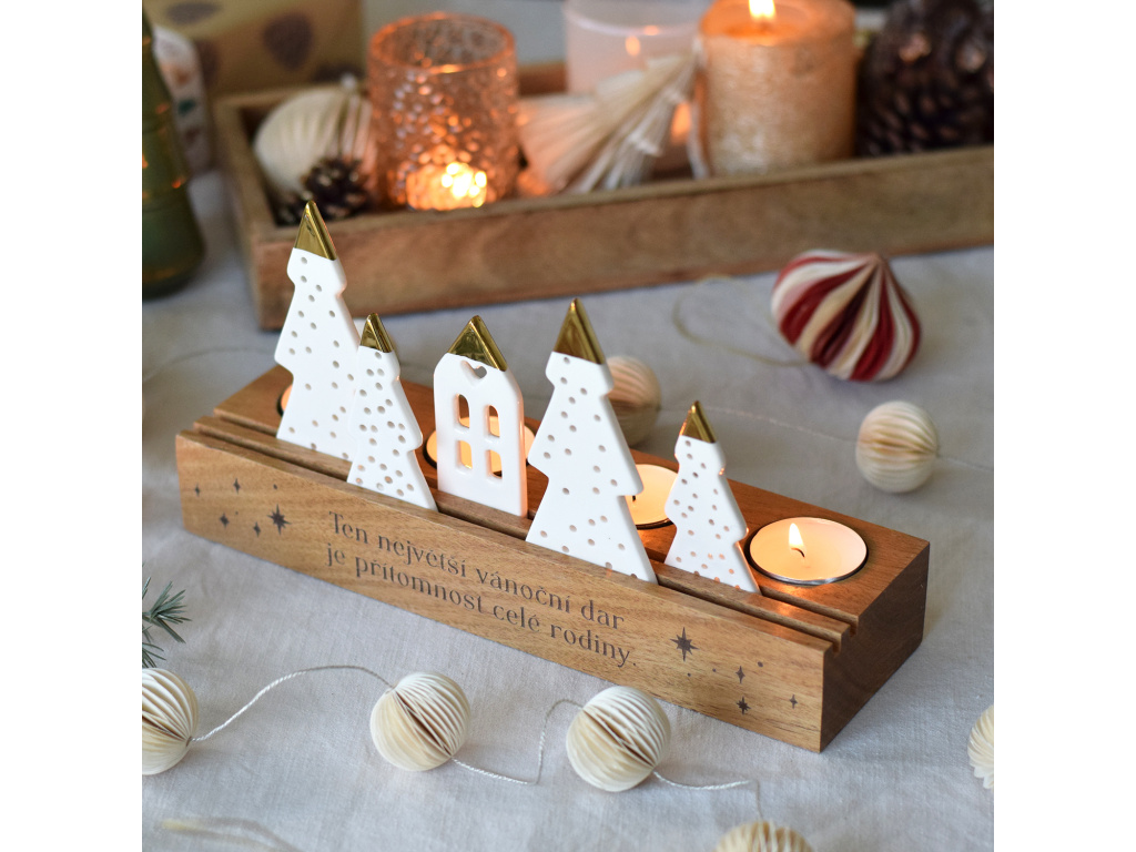 Představujeme vám unikátně navržený svícen, který o Vánocích rozzáří každý domov. Kombinace mangového dřeva a milých porcelánových ozdob, se kterými si můžete libovolně posouvat, je prostě dokonalý.