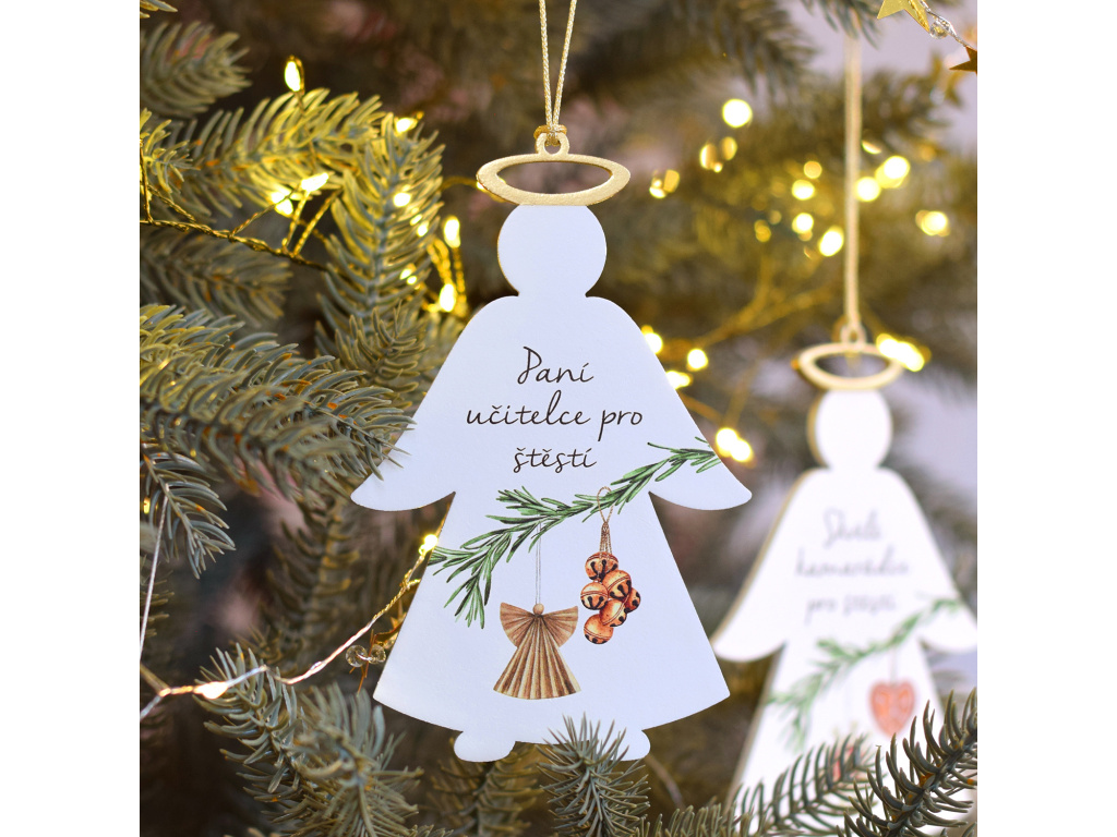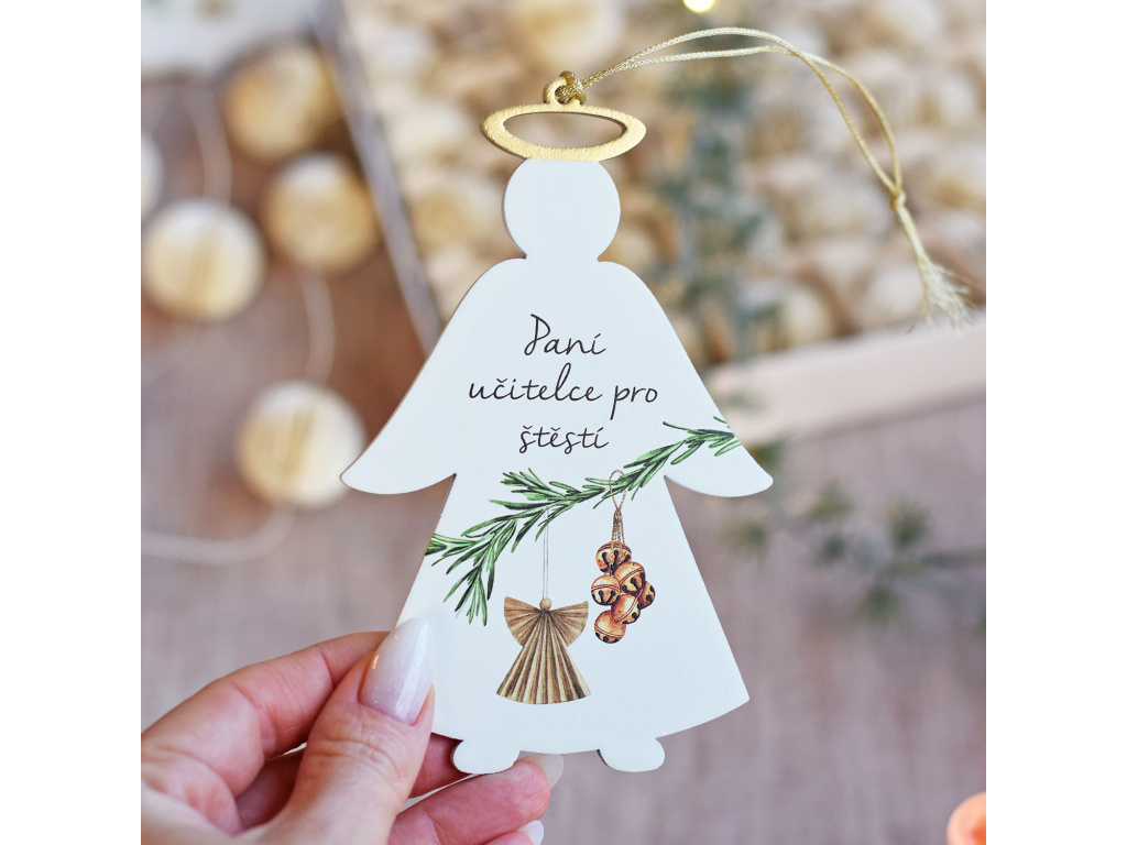 Pokud byste rádi před Vánoci darovali malou pozornost své paní učitelce, pak vás jistě zaujme tento dřevěný andílek s českým textem. Andílek je dekorován ozdobami, které jsou součástí celé vánoční kolekce Kouzlo Vánoc. Andílek je doplněn zlatou svatozáří a také zlatou šňůrkou.