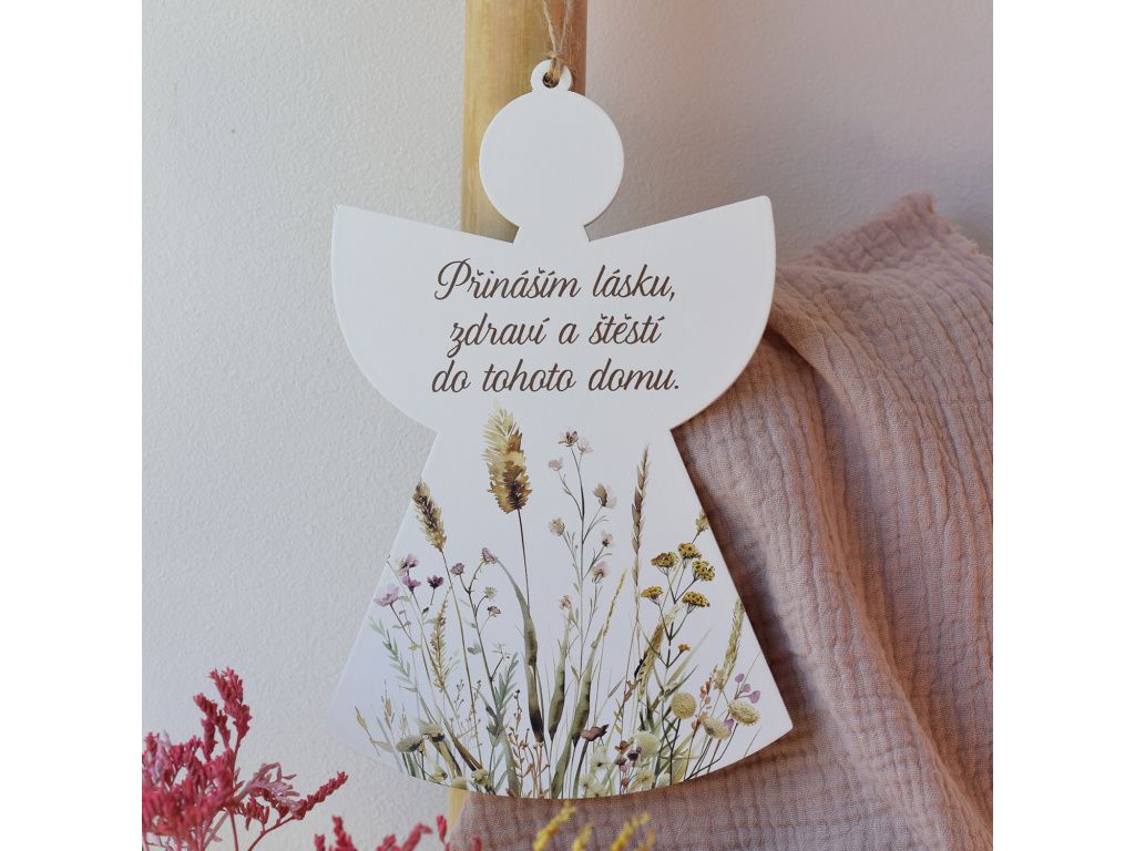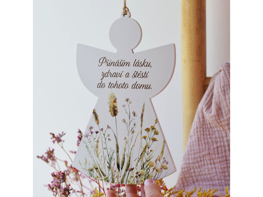 Krásná dekorace s milým poselstvím, která promění každý domov v místo plné pohody. Dřevěný anděl s jemným květinovým motivem a nápisem „Přináším lásku, zdraví a štěstí do tohoto domu“ je symbolem harmonie, klidu a pozitivní energie.
