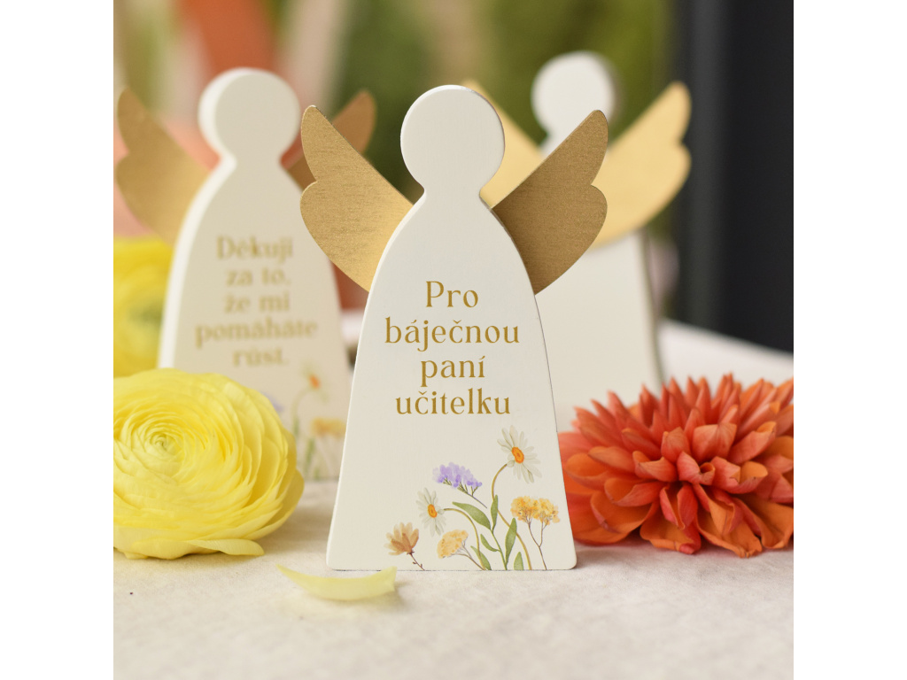 Věnujte tohoto andílka se zlatými křídly své paní učitelce jako poděkování za skvělou péči.