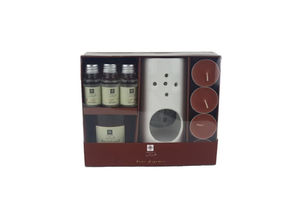 Dárková sada obsahuje aromalampu, 3 oleje, 1 vonnou svíčku a 4 vonné čajové svíčky.