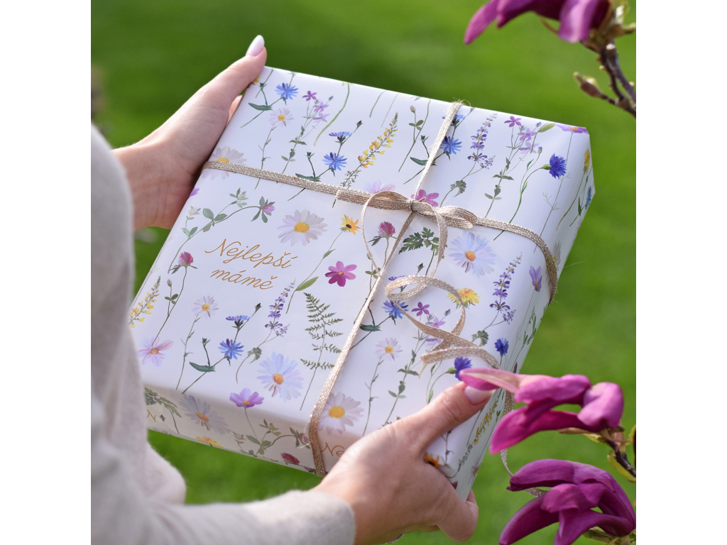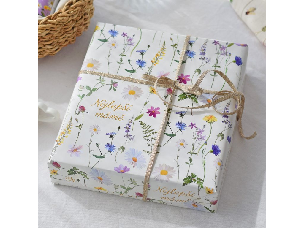 Chystáte pro svoji maminku velkolepý dárek? A co jej ještě trošku nazdobit? Zabalte jej do balicího papíru s českým textem a krásné tištěnými květinami.