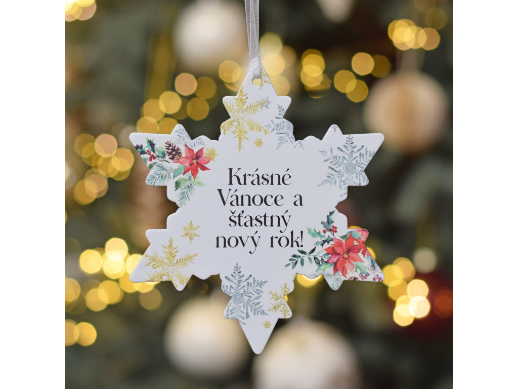 Pokud hledáte drobný dárek, kterým potěšíte své blízké, pak jím může být právě tato dřevěná vločka z naší dílny, která je doplněná o vánoční motiv a český text.