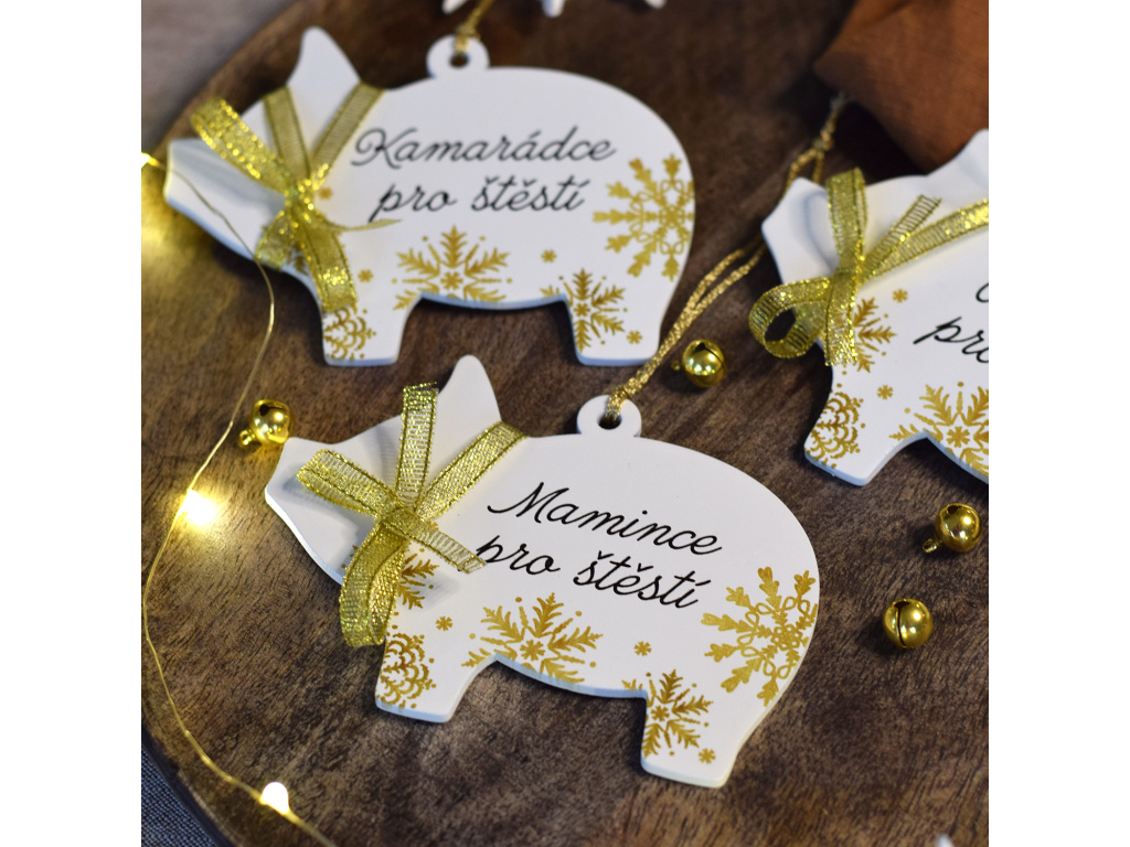 Díky praktickému provázku lze snadno zavěsit na vánoční stromeček, větvičku či jinou dekoraci. Symbol prasátka přináší štěstí, a proto je tento drobný dárek ideálním způsobem, jak potěšit maminku a vyjádřit jí lásku a přání všeho dobrého.
