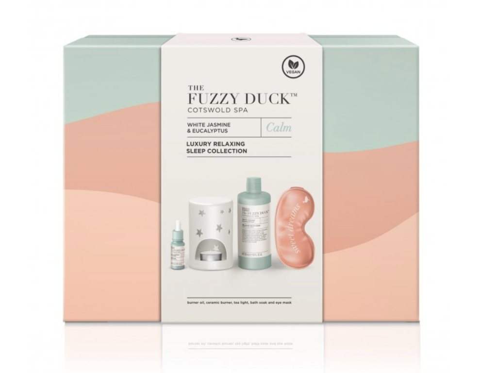 Luxusní dárková sada pro relaxaci a klidný spánek obsahuje mléko do koupele, aroma lampa se svíčkou, olej do aromalampy a masku na oči. S uklidňující a uvolňující vůní jasmínu a eukalyptu.