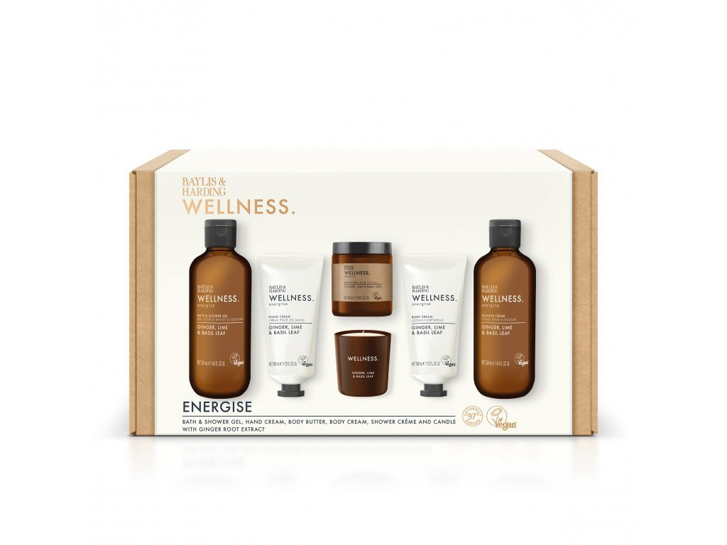 Luxusní dárková sada obsahuje sprchový krém, sprchový gel, krém na ruce, tělový krém, krém na ruce, tělové máslo a vonnou svíčku s uvolňující vůní zázvoru, citrónu a bazalkových listů.