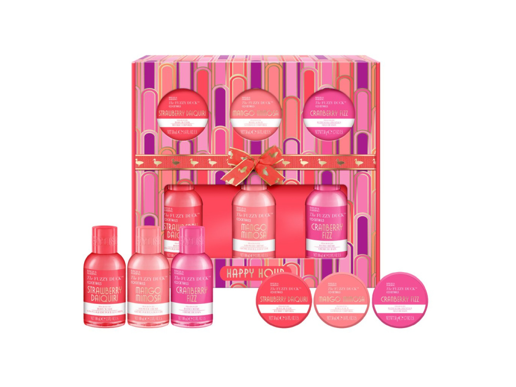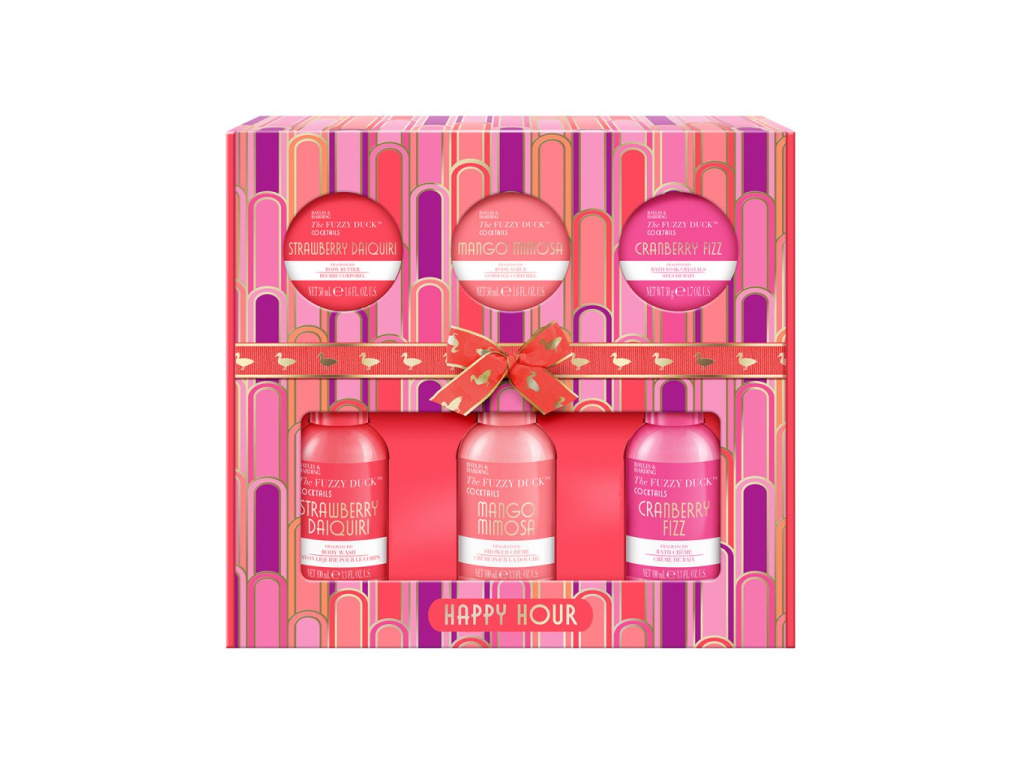 Užijte si voňavou koktejlovou párty i během své péče o tělo. Tato hravá sada pečujících produktů v sobě spojuje ty nejoblíbenější vůně inspirované koktejly – Strawberry Daiquiri, Mango Mimosa a Cranberry Fizz. Obsahuje výběr mini produktů pro kompletní péči o tělo – od sprchových gelů přes hydratační péči až po koupelové doplňky, takže si můžete dopřát kompletní Wellness rituál v pohodlí domova. Výrazný design s růžovými tóny a zlatými detaily ve stylu Art Deco udělá z této sady krásný dárek k narozeninám nebo pod vánoční stromeček.