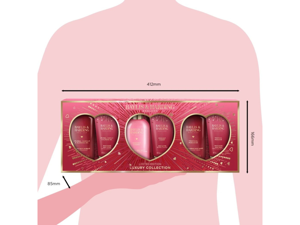 Dopřejte si okamžiky naprostého rozmazlování s touto nádhernou dárkovou sadou od Baylis & Harding, která spojuje tři oblíbené vůně – sladce ovocnou Midnight Cherry, exotickou Tropical Paradise a hřejivou, jemně sladkou Jojoba, Vanilla & Almond Oil. Sada je zabalená ve slavnostní krabičce se zlatými detaily, díky čemuž se hodí jako elegantní dárek pro každou příležitost nebo jako zasloužená odměna pro vás samotné.