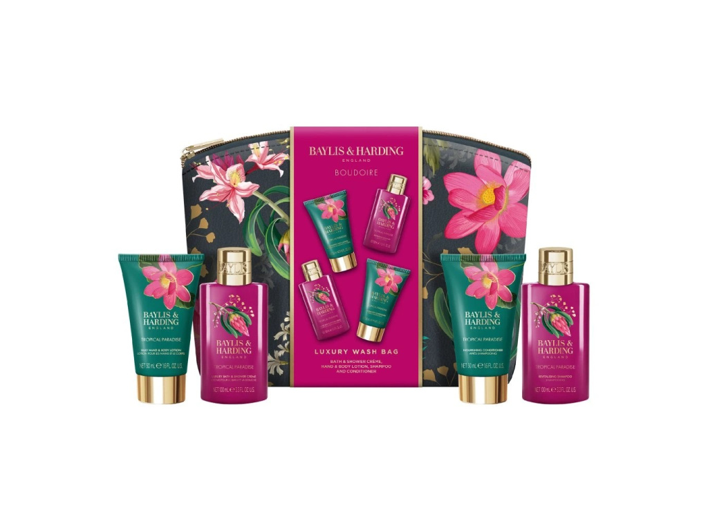 Tato elegantní dárková sada přináší čtyři pečující produkty pro tělo a vlasy, které se postarají o každodenní rituál krásy. Obsahuje sprchový krém pro jemné čištění a relaxaci, šampon pro svěží a hebké vlasy a kondicionér pro jejich výživu a snadné rozčesávání. Nechybí ani vyživující tělové mléko pro hebkou pokožku. Všechny produkty provoněné vůní banánu, broskve a pomerančových květů jsou uloženy v elegantní kosmetické taštičce s květinovým motivem.