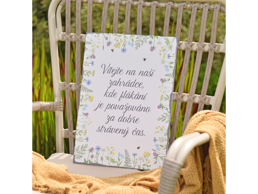 Krásná cedule na zahradu zdobená motivem lučního kvítí, která Vás při každém pohledu potěší! Zdobí ji originální český citát, který vyzývá k odpočinku na vaší zahrádce.
