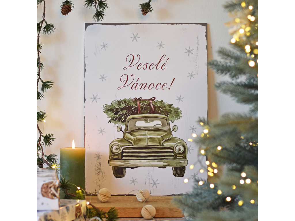 Motiv starého auta vezoucího vánoční stromek vyvolává pocit tradičních Vánoc plných radosti, pohody a rodinného tepla. Skvěle se hodí jako dekorace na zeď, poličku nebo komodu – a krásně doplní rustikální či vintage vánoční výzdobu.