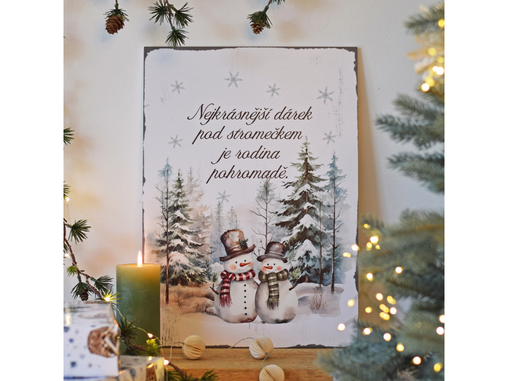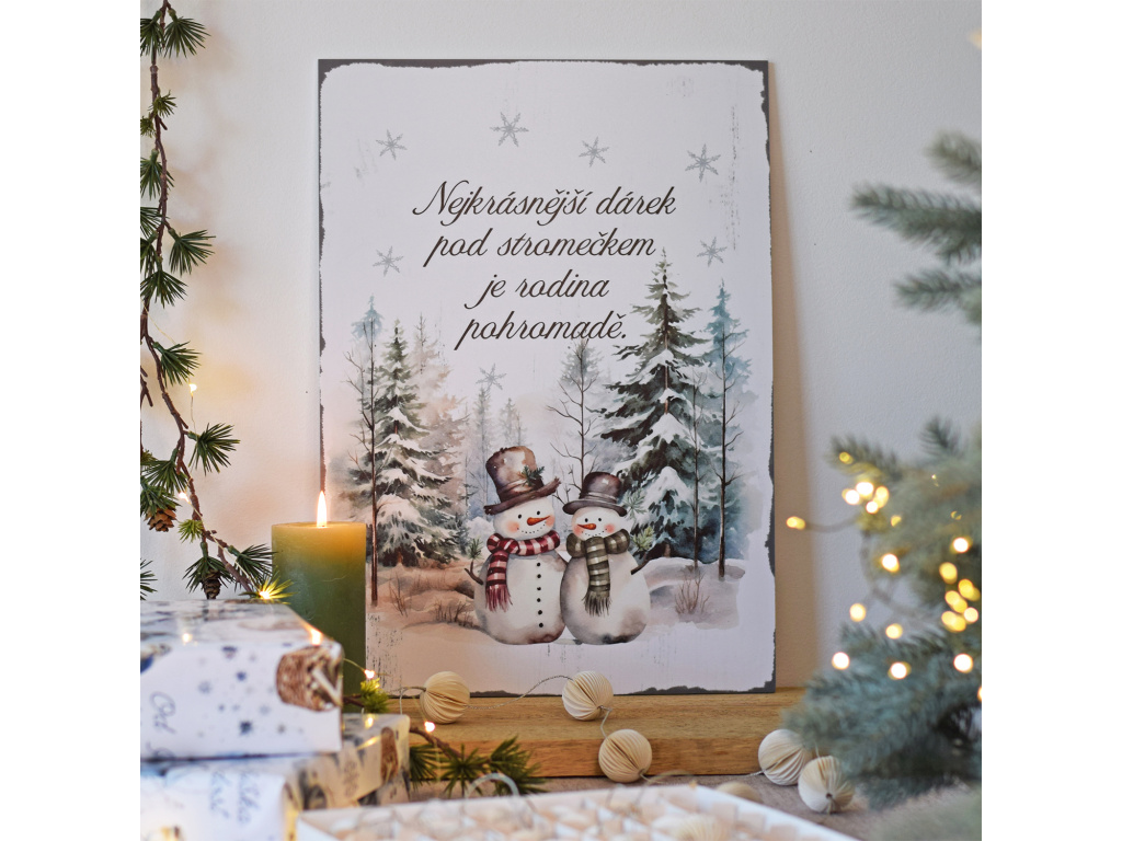 Dekorace s jemným zimním motivem sněhuláků a zasněžených stromů krásně doplní váš sváteční interiér. Ideální jako ozdoba na poličku, komodu či zeď – a také jako milý dárek pro vaše blízké.