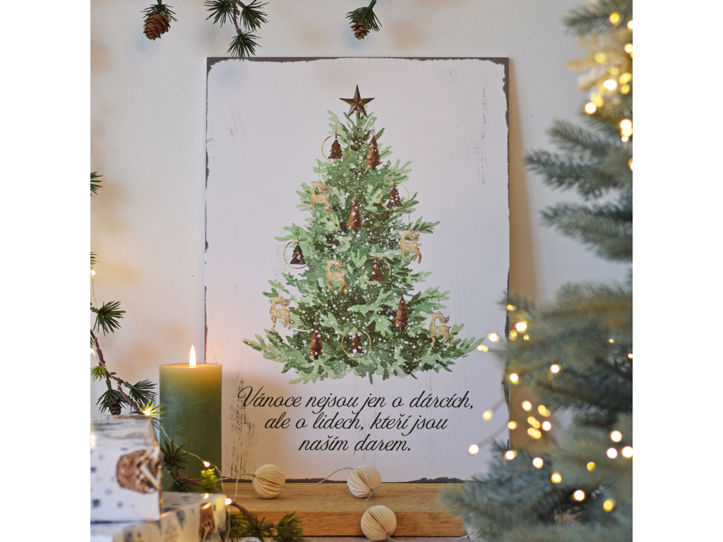 Tento jemný design s malovaným vánočním stromkem v rustikálním stylu  vnese do vašeho domova hřejivou atmosféru klidu, lásky a rodinné pohody. Cedulka se skvěle hodí na poličku, komodu nebo zavěšení na zeď a stane se krásným doplňkem vašeho vánočního koutku.