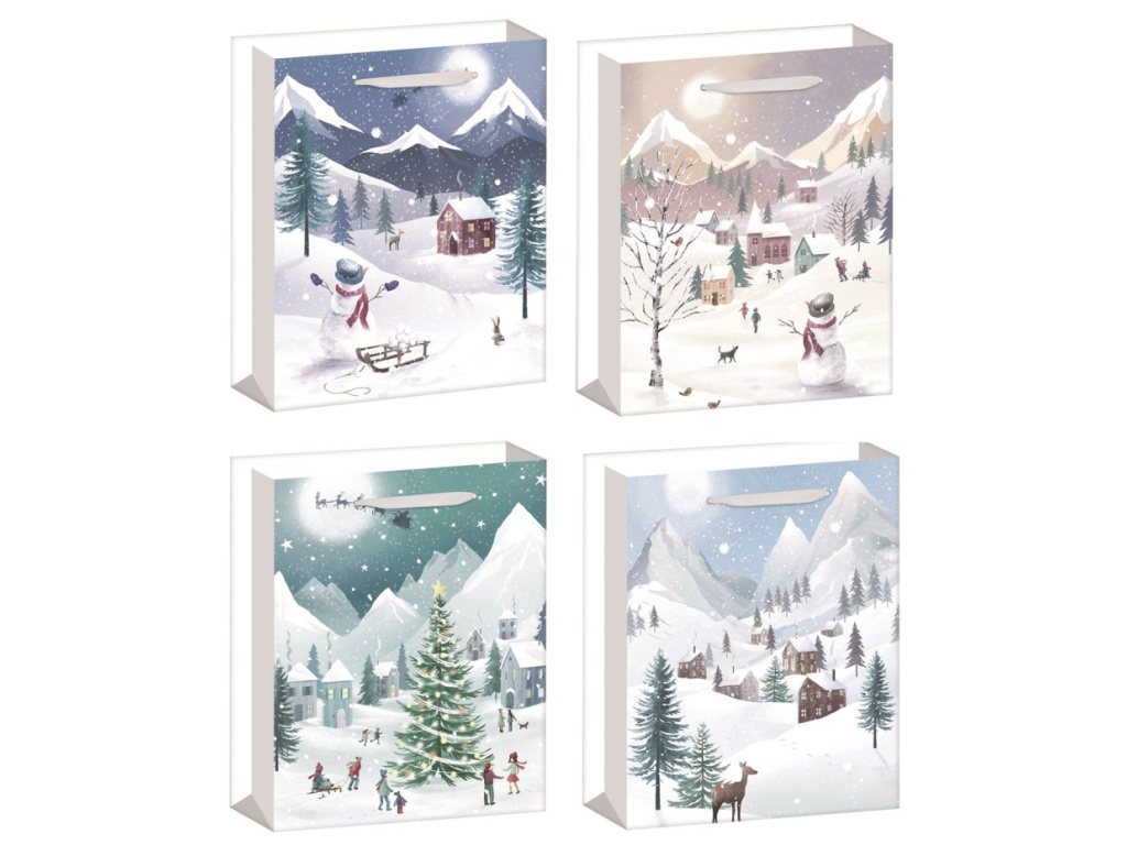 Papírová taška zimní krajinka Nestíháte ve vánočním shonu balit dárky? Vyřešte to jednoduše a rychle s některou z dárkových tašek! Pod vánočním stromečkem se budou krásně vyjímat. Čtyři motivy, posíláme v mixu.