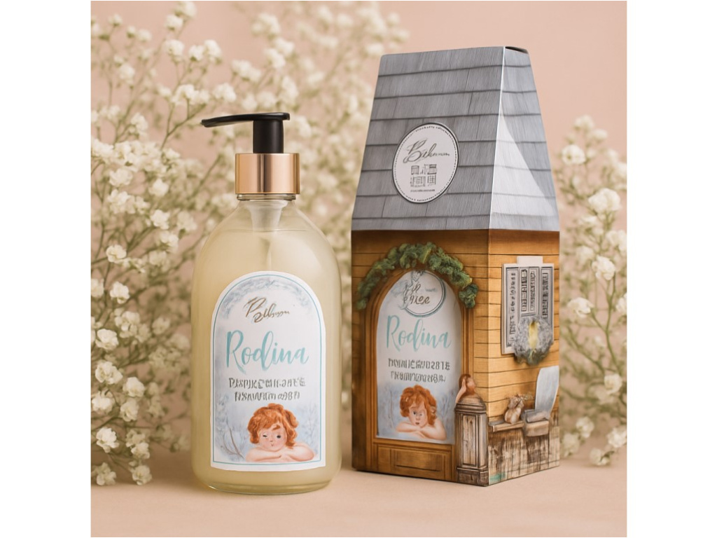 Rodinný sprchový gel 3v1 s vůní pivoňky v papírové krabičce ve tvaru domečku