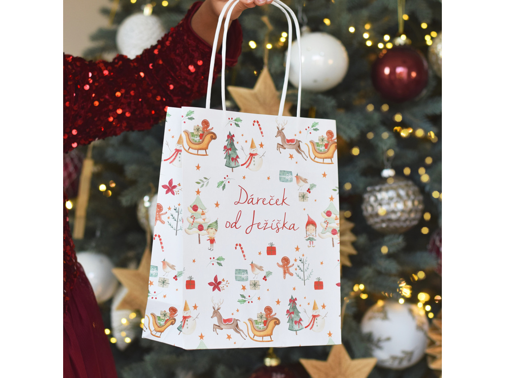 Dárková taška - Dáreček od Ježíška - Vánoční skřítci Tuto krásnou originální dárkovou tašku prostě nutně potřebujete! Taška je zdobená motivem vánočních skřítků a je doplněná o český text! Navíc, motiv je potištěn po celé ploše tašky a věřte, že je opravdu roztomilý! S touto dárkovou taškou potěšíte každého vánočního nadšence! rozměr: 180 x 225 x 80 mm materiál: pevný kraftový papírDoplňkové parametry