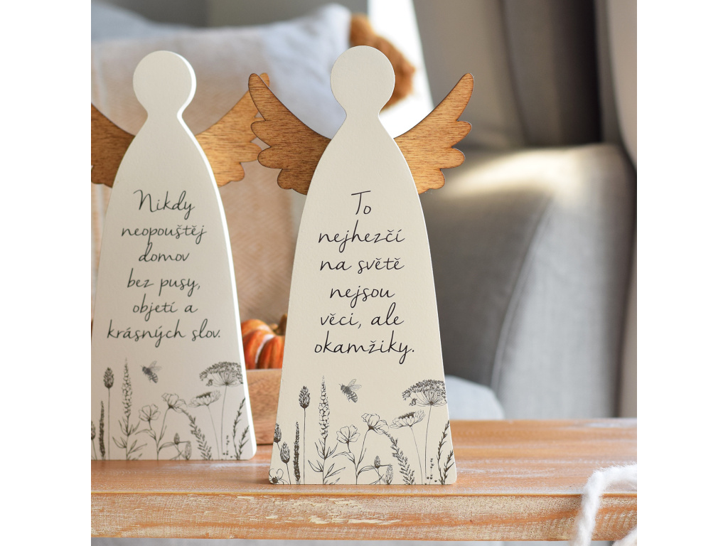 Naše kolekce velkých andělů s motivem lučního kvítí Vás naprosto nadchne! Pečlivé zpracování a kvalitní potisk českým textem je pro nás prioritou. Mějte i Vy doma svého anděla s oblíbeným citátem. Jsou tvořeny s láskou do českých bydlení. Ať Vám tito andělé přinesou štěstí a zútulní Váš domov.