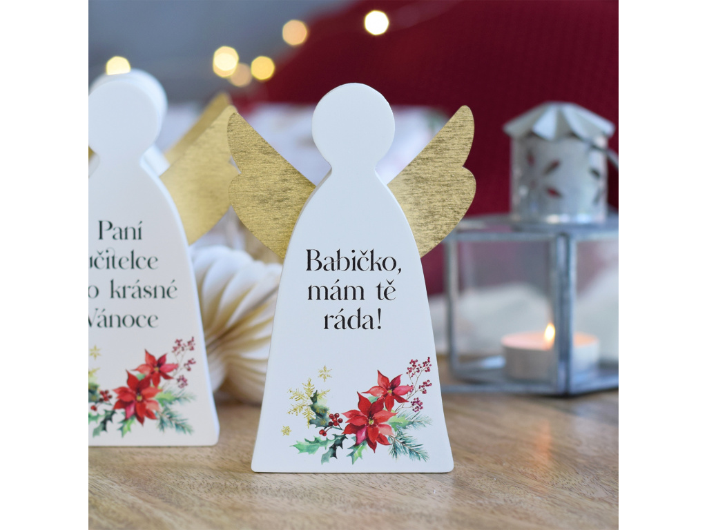 Darujte o Vánocích něco speciálního. Tento unikátní andílek s českým textem uhrane pohledem. Na jeho zpracování si necháme velmi záležet, aby mohl dělat radost každému, kdo jej dostane. Kombinace českého textu a velmi kvalitniho tisku je u nás samozřejmostí.