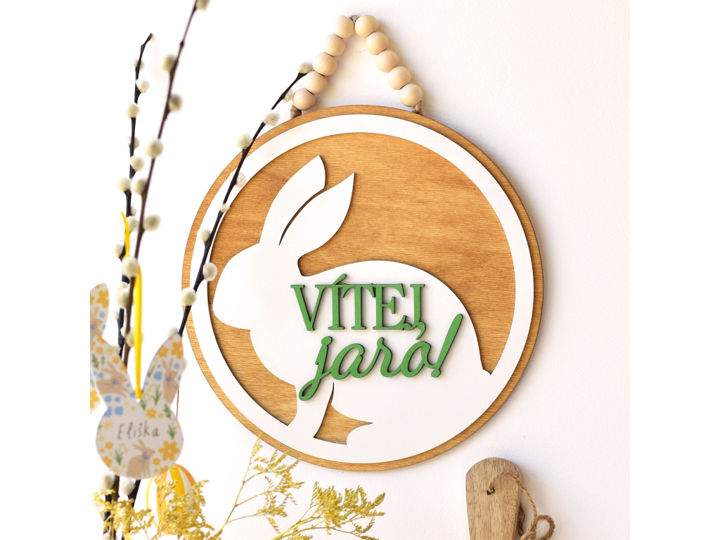 Dřevěná dekorace na zavěšení s motivem zajíčka a jarním nápisem. Česká kruhová dekorace je doplněna o dřevěné korálky.