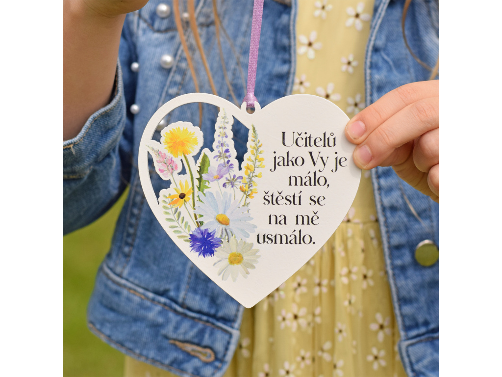 Překrásné dárkové srdce s motivem lučního kvítí je vyřezávané a doplněno o oblíbené citáty pro paní učitelky.