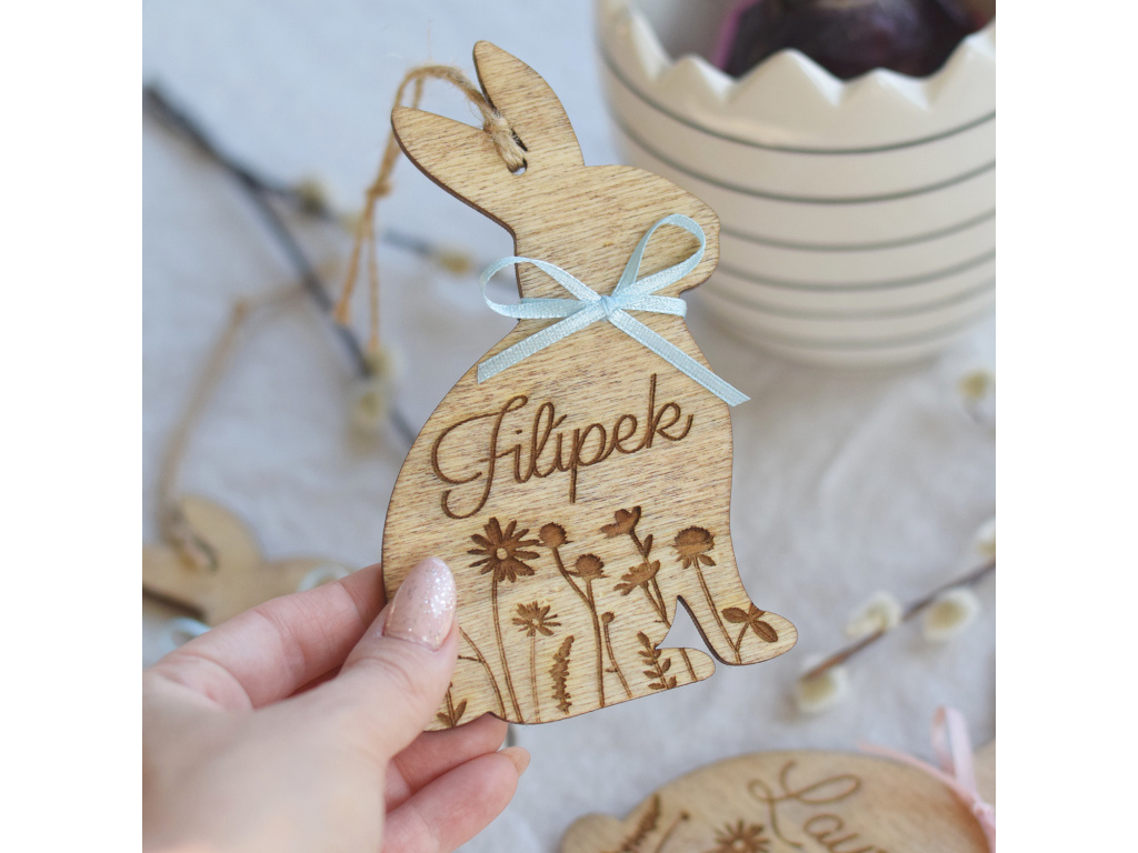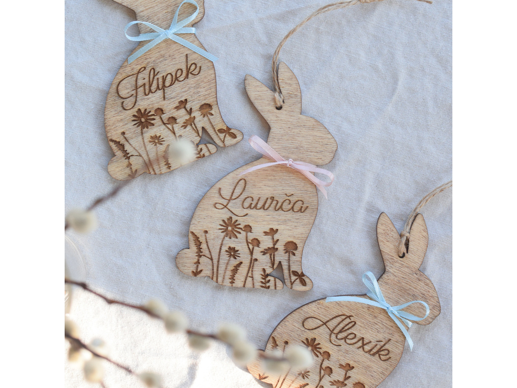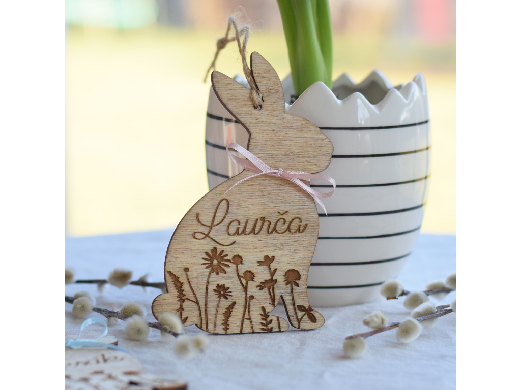 Vyřezávaný zajíček se jménem na míru udělá hodně parády a ozdobí originálně Váš domov. Skvěle bude vypadat zavěšený na proutí nebo na větvích kočiček či zlatého deště.