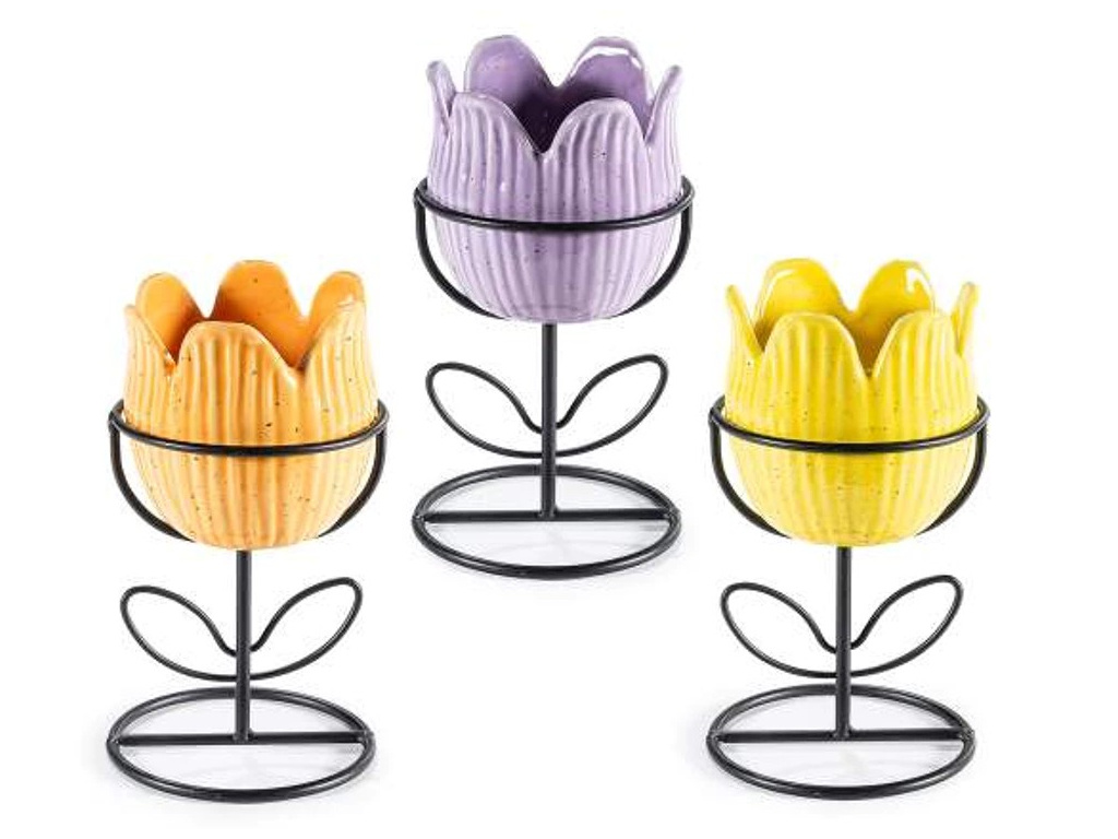 Tulipánově tvarované keramické vázy na kovovém podstavci - Velikost: Ø 8,5 cm x 14,5 cm H Váza: Ø 7,5 cm x 7 cm H - Základna: Ø 4,5 cm.