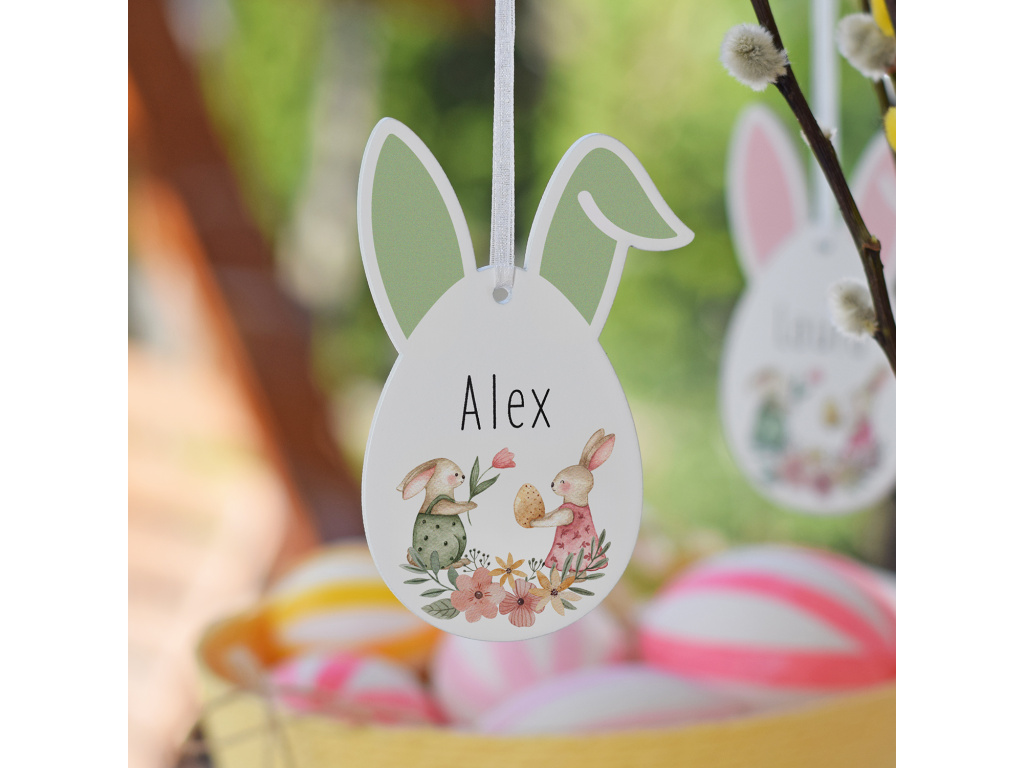 Jemná ilustrace zajíčků a květin dodává dekoraci něžný jarní vzhled a díky ouškům připomíná malého velikonočního ušáčka. Vajíčko krásně vynikne zavěšené na větvičce, na dětském košíčku nebo jako milá jmenovka u velikonoční nadílky.