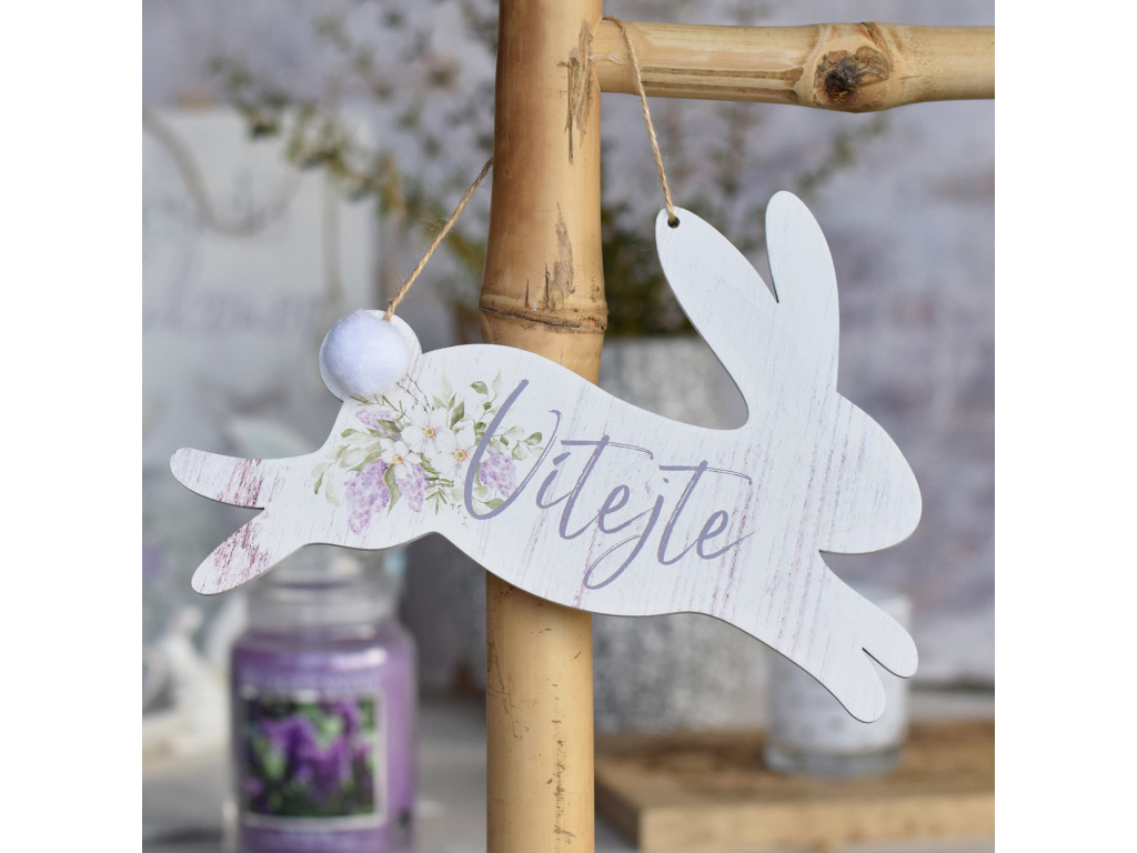 Dřevěná cedulka s podobou velikonočního zajíčka je zajímavým doplňkem na dveře nebo do vaší předsíně. Uvítejte vaši návštěvu či koledníky stylově!