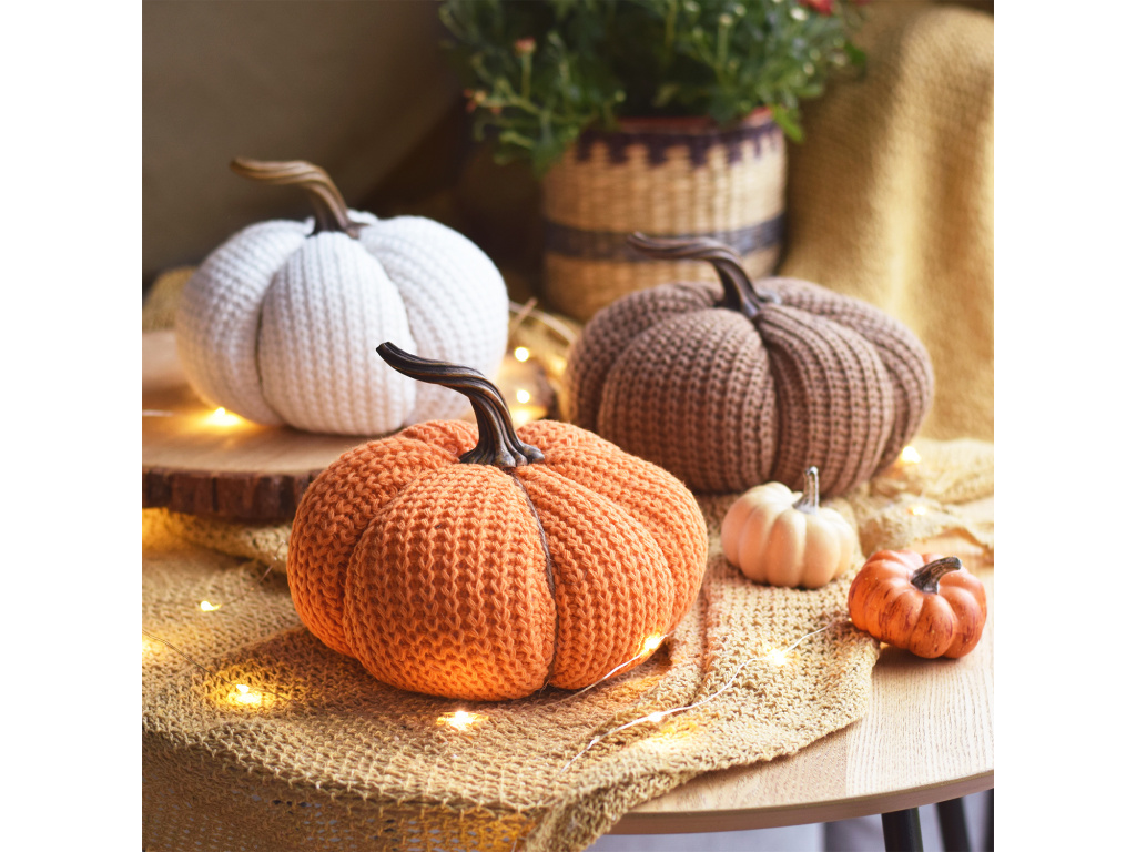 Dýně z textilu XXL - Deluxe edition - 3 motivy na výběr Zažijte kouzlo podzimu s naší textilní dýní! Tento nádherně vyrobený, ručně šitý domácí doplněk přinese do vašeho domova nádech této barevné sezóny. Textilní dýně je skvělým doplňkem k vašemu podzimnímu dekoru. Je vyrobená z kvalitních materiálů a je k dispozici ve třech krásných podzimních barvách - oranžové, hnědé a bílé. Tato dýně je tak skutečnou podzimní ikonou a dokonale doplňuje jakýkoli stylový interiér.Nemusíte se obávat o jakékoliv špatné počasí ani o to, že dýně ztratí na své barvě nebo kvalitě. Je odolná, pevná a jednoduchá na údržbu. Na rozdíl od pravých dýní, které se kazí, naše textilní dýně vydrží roky.Náš produkt je ideální pro každého, kdo miluje podzim a chce do svého domova vnést trochu této podzimní atmosféry. Textilní dýně je skvělým doplňkem do obývacího pokoje, kuchyně, ložnice nebo dokonce i kanceláře. Dejte svému prostoru osobitý nádech s tímto úžasným doplňkem. Materiál: textil Rozměry: 18x15x18cm Barva: hnědá, oranžová, bílá