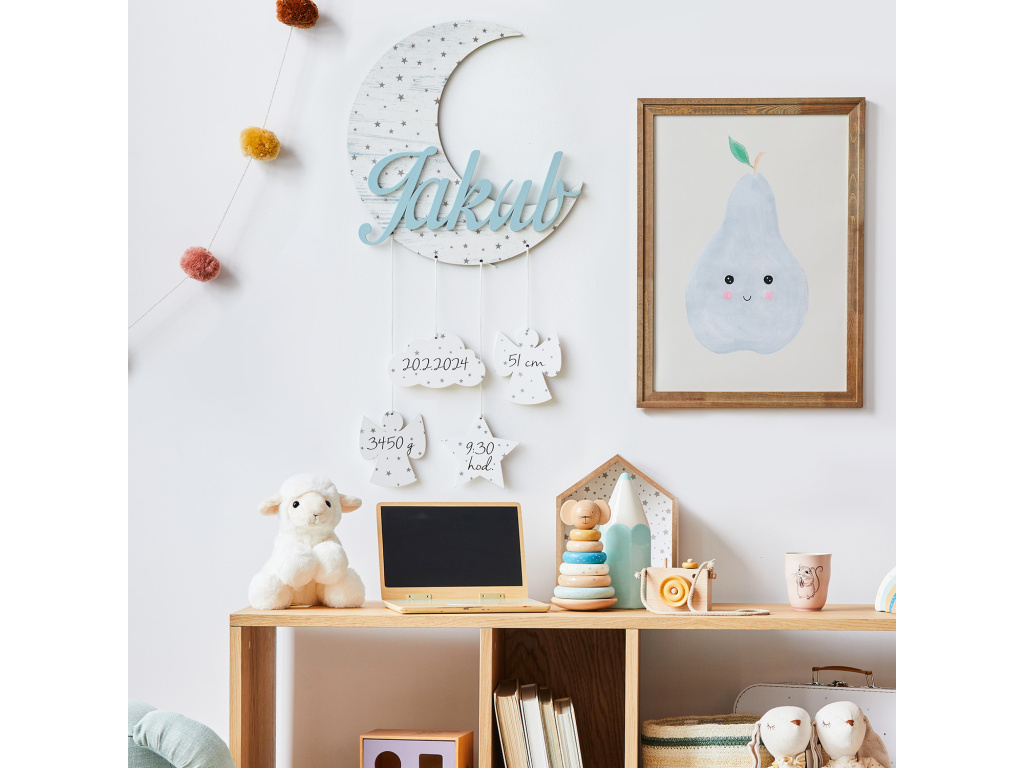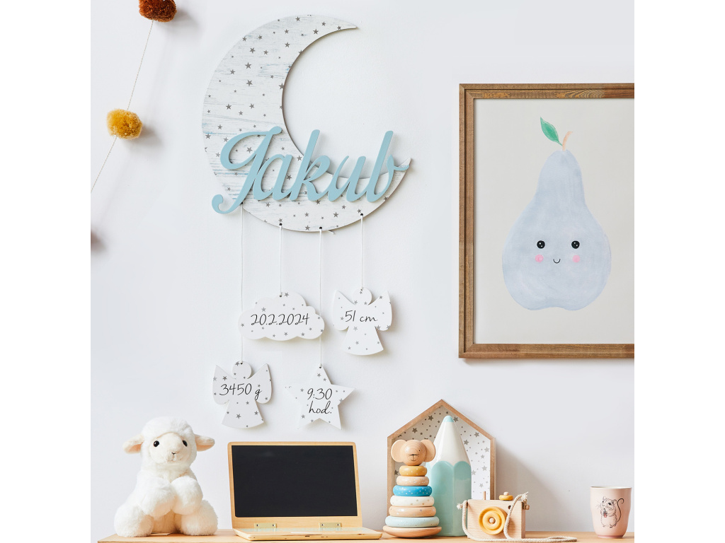 Kouzelná dřevěná dekorace ve tvaru měsíčku s vyřezaným dětským jménem na míru. Ke každému měsíčku patří i závěsné ozdoby s porodními údaji dítěte. Motiv hvězdiček, který zkrášluje celou dekoraci působí velmi jemně a do dětských pokojíčků se velmi hodí.