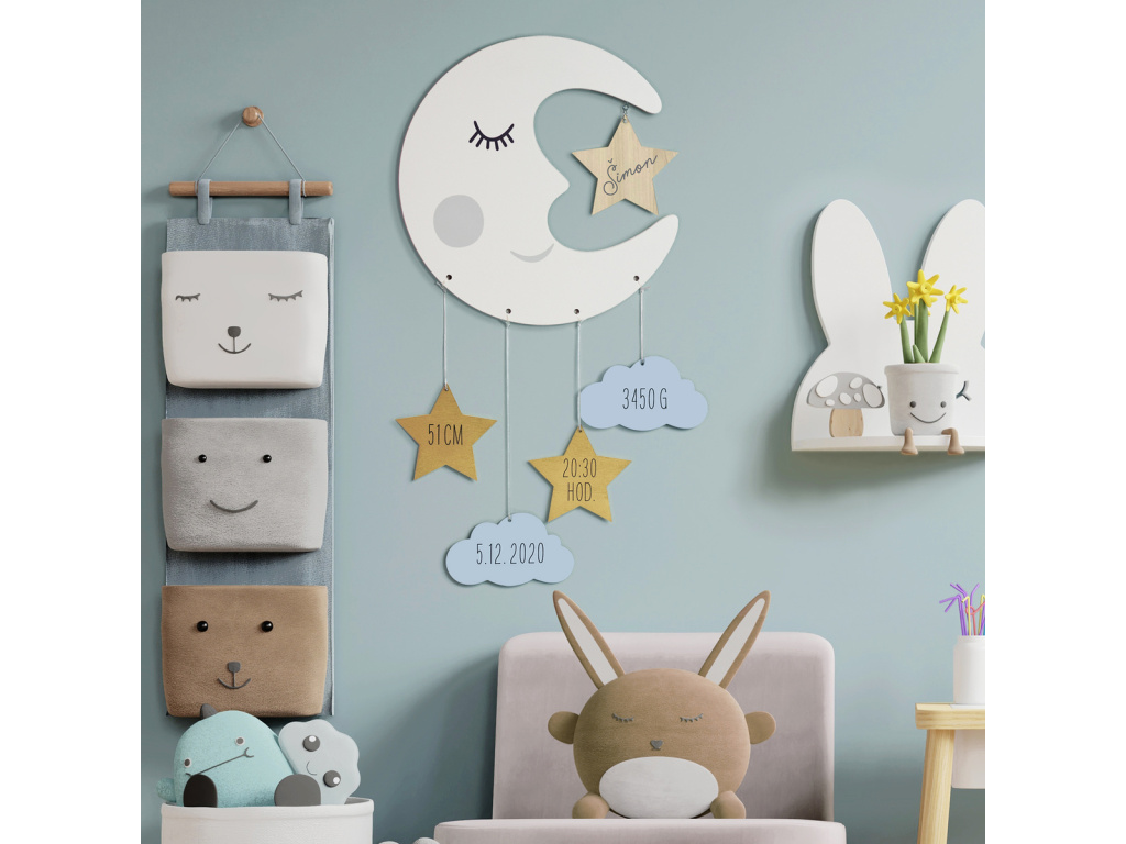 Měsíček spinkáček pro kluky Moderní, roztomilá dekorace do dětského pokojíčku, která drží krok s dobou! Vystylujte dětské království s tímto krásným měsíčkem, který obsahuje všechny důležité údaje o narození Vašeho miminka. Bude tak krásnou vzpomínkou na tento jedinečný den. Kvalitní provedení v decentních pastelových tónech se zlatými prvky a bavlněnou šňůrkou se Vám jistě zalíbí. Měsíček jednoduše zavěsíte pomocí kovového závěsu, který je upevněn ze zadní strany. Velikost dekorace po zavěšení cca: 60 x 32 cm Všechny údaje jako je: JMÉNO, VÝŠKA, VÁHA, HODINA NAROZENÍ, DATUM NAROZENÍ pište do poznámky k produktu na míru již při vyplnění objednávky.Doplňkové parametry
