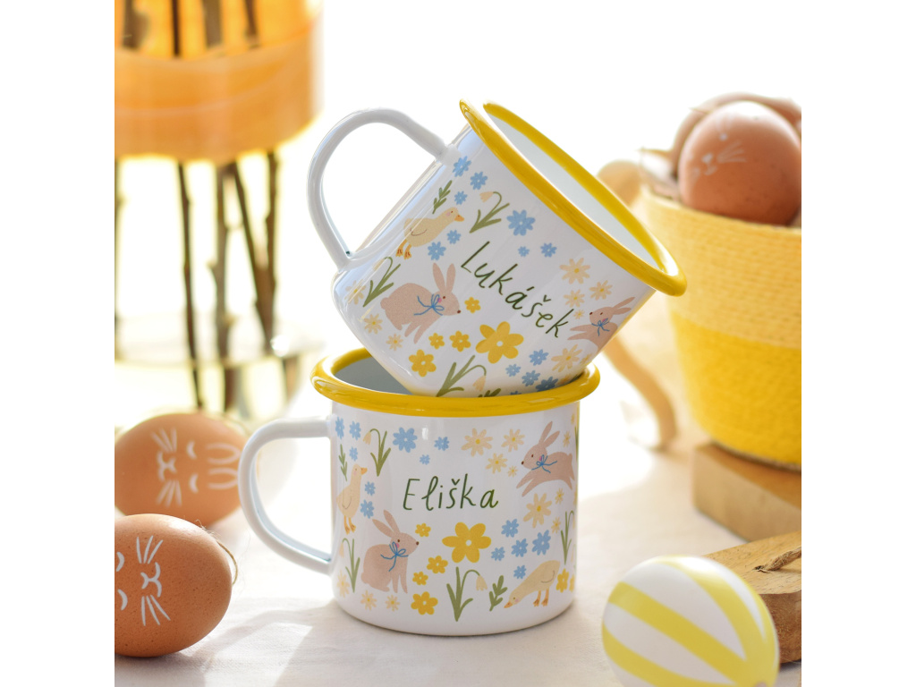 Nalaďte své nejmenší na hřejivou jarní atmosféru. Tento plecháček se žlutým lemem je ozdoben jarním motivem se zajíčky a květinami.
