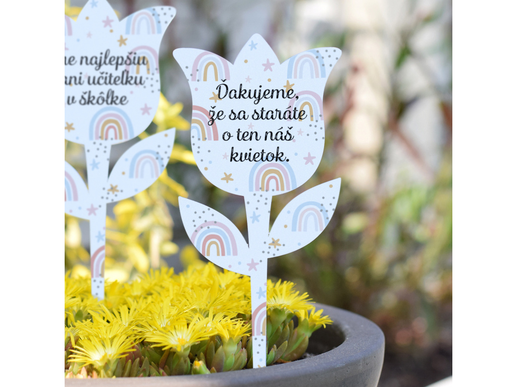 Veselý tulipán jako zápich do květináče pro paní učitelku. Ať už jej věnujete samostatně nebo s květinou, jistě udělá velkou radost.