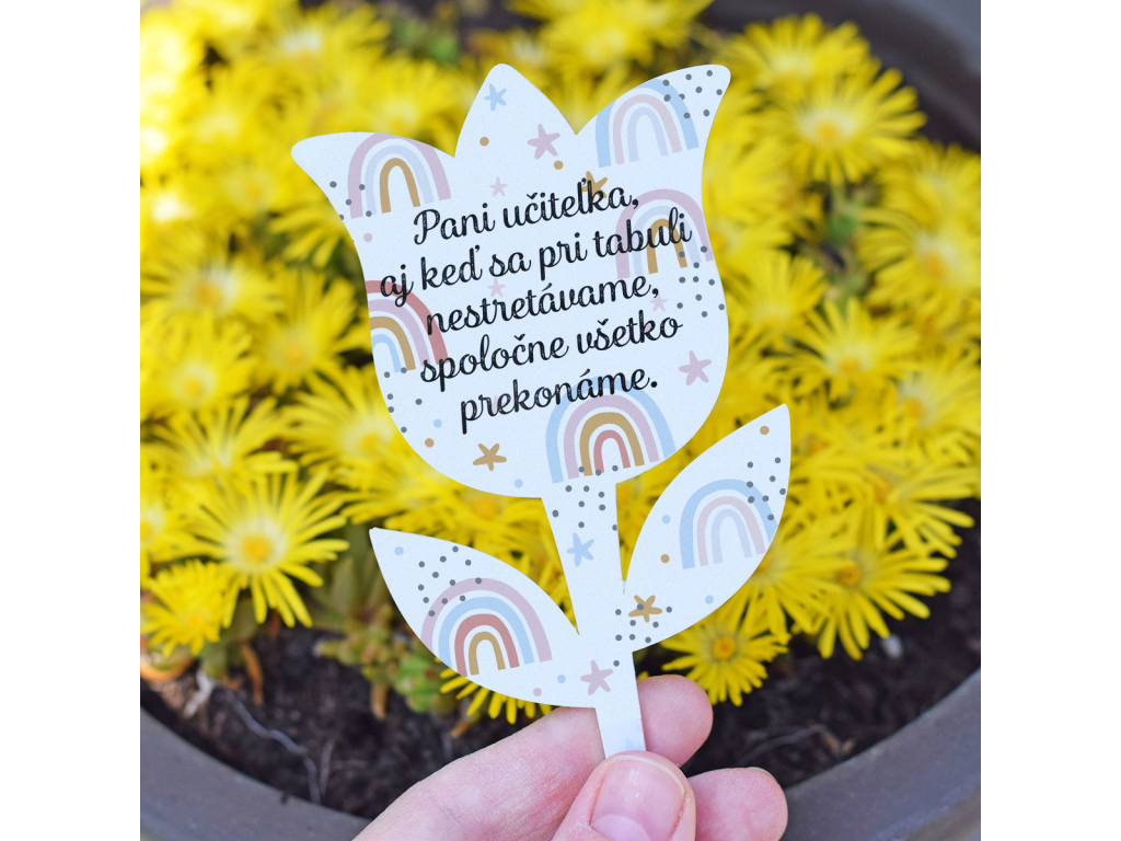 Veselý tulipán jako zápich do květináče pro paní učitelku. Ať už jej věnujete samostatně nebo s květinou, jistě udělá velkou radost.