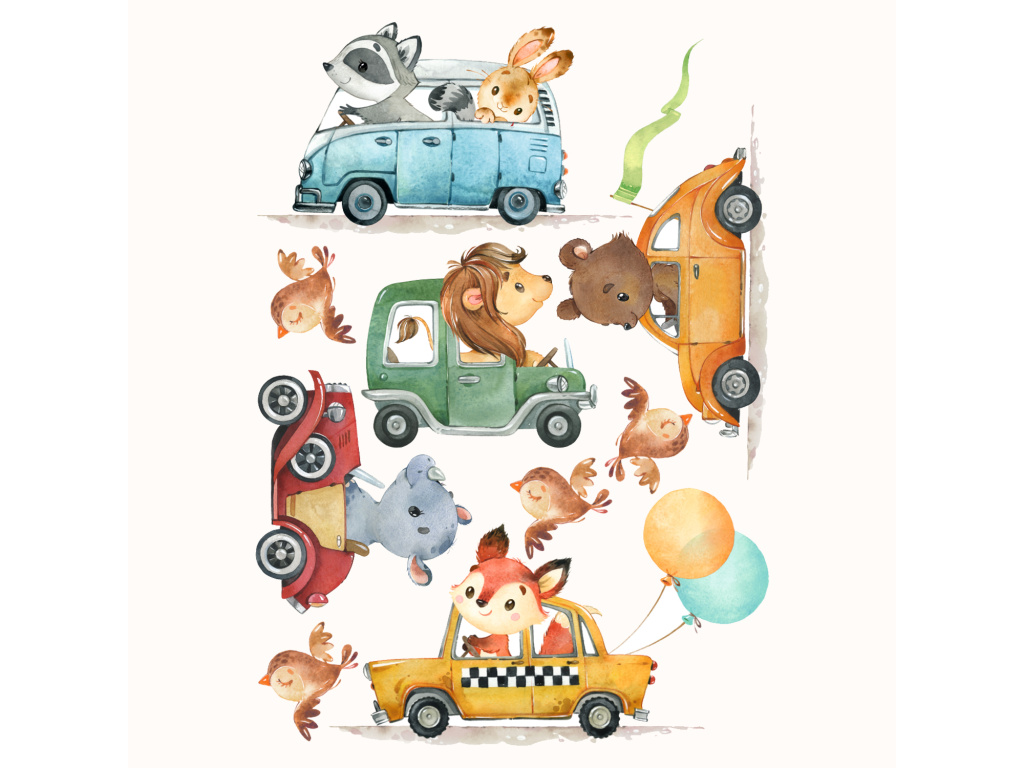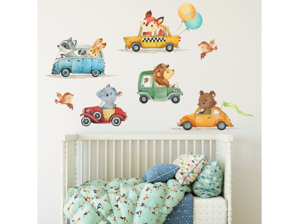 Představujeme báječný motiv samolepky na zeď se zvířátky a autíčky, který se hodí skvěle do pokojíčků každého malého závodníka.
