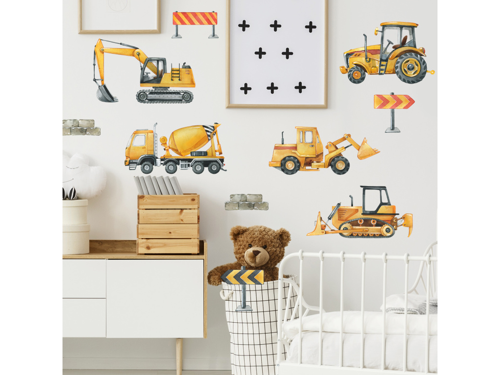 Tato samolepka na stěnu je snem každého malého chlapce. Kvalitně potištěné pracovní stroje jako je traktor, míchačka, bagr a další se budou vyjímat v klučičím pokojíčku!