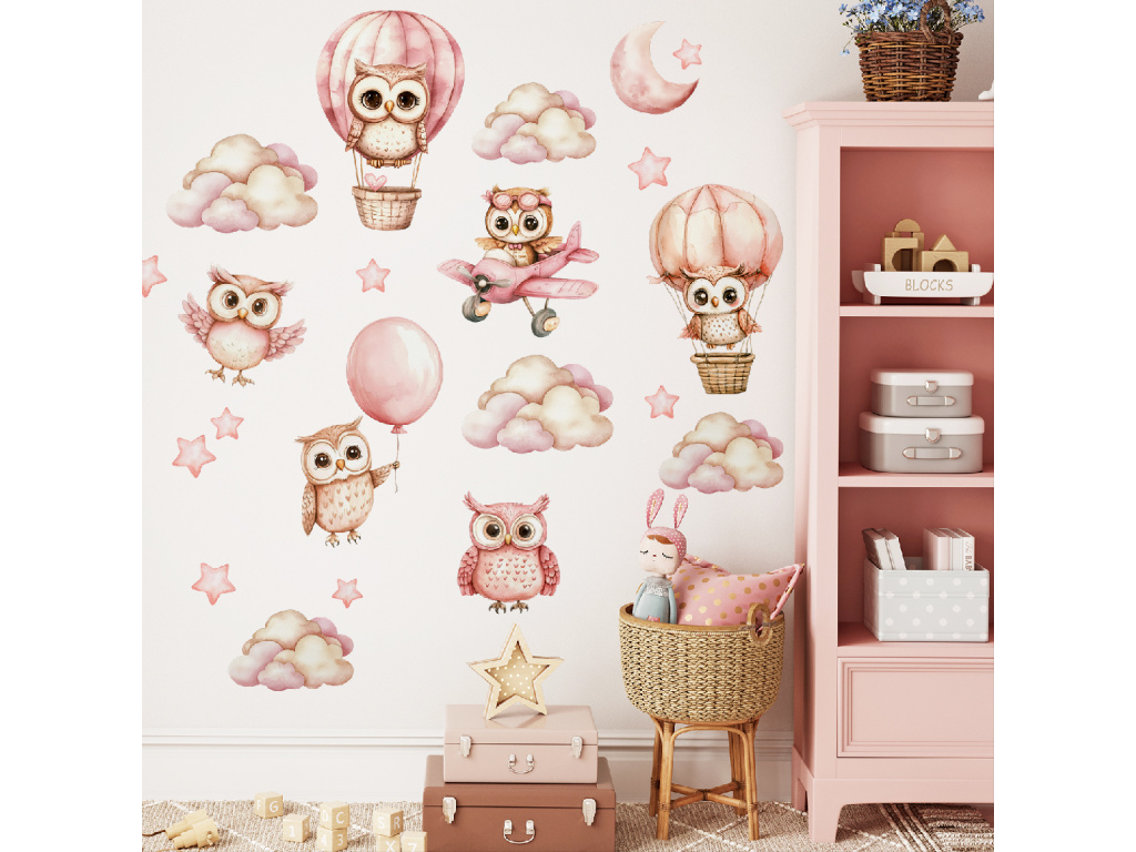 Proměňte dětský pokojíček v pohádkový svět plný něhy a fantazie. Růžové sovičky přilétají mezi obláčky, hvězdičky a horkovzdušné balóny, aby vytvořily kouzelnou atmosféru, ve které se bude krásně usínat i snít.