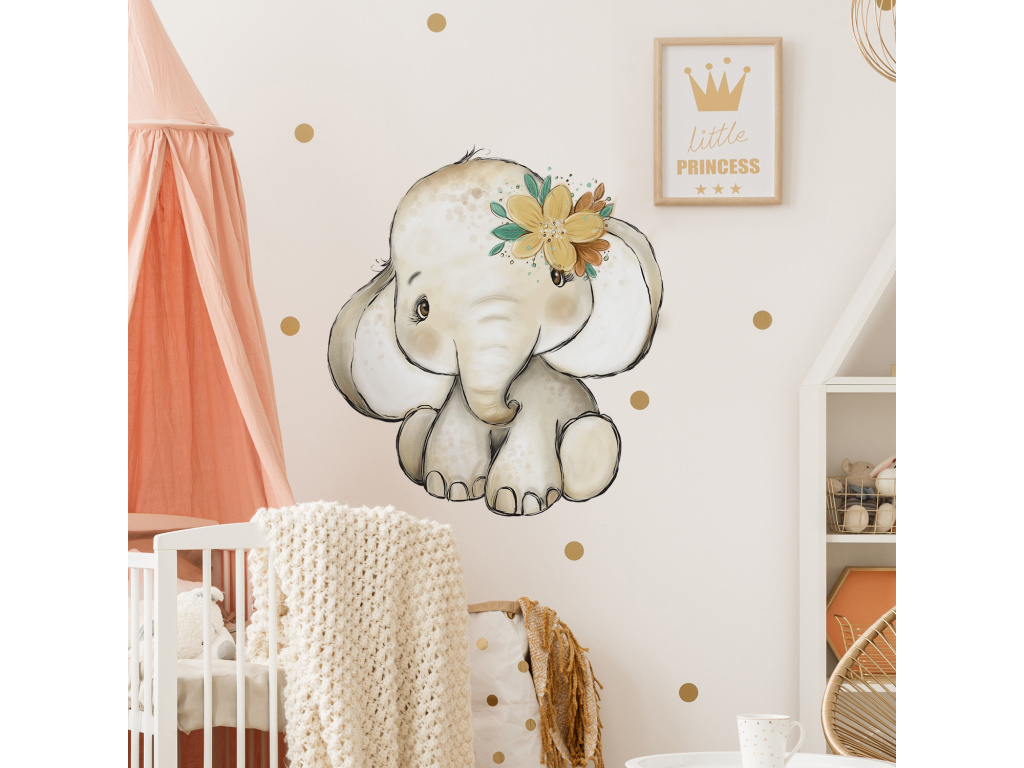 Hravá samolepka s motivem slůněte, které je zdobeno květinami je krásným doplňkem do pokojíčku každé holčičky