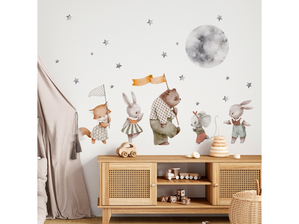 Veselé samolepka na stěnu se zvířátky a noční oblouhou vykouzlí úsměv každému dítěti. Ozdobte i vy dětský pokojíček s touto kvalitní samolepkou na zeď.