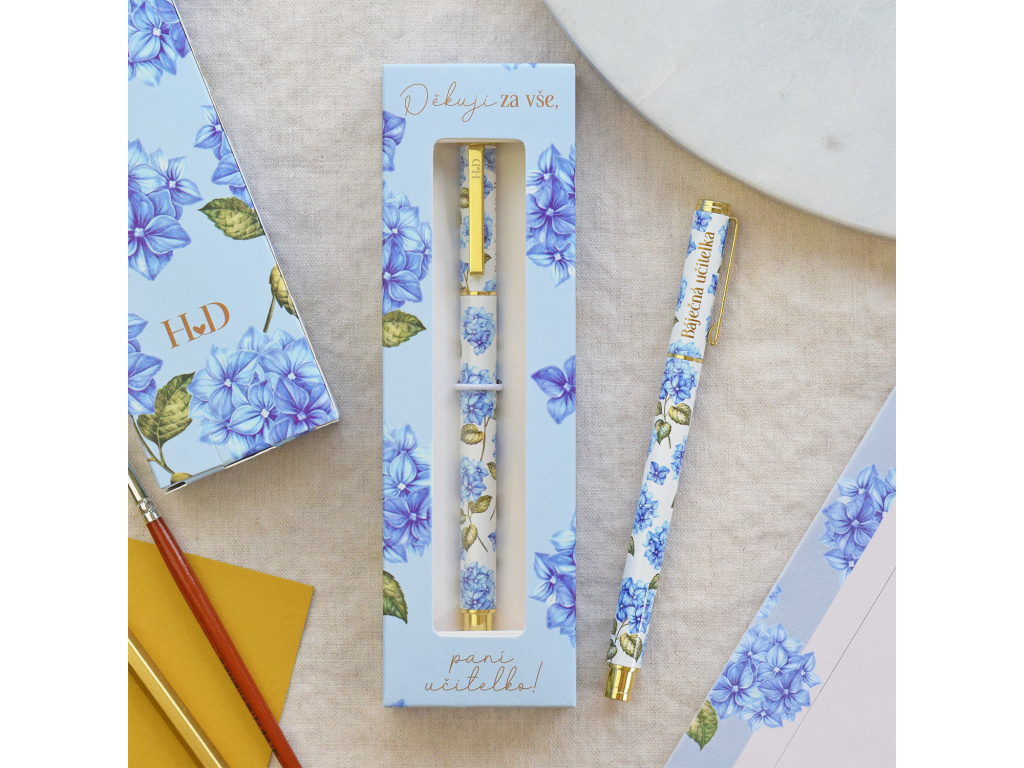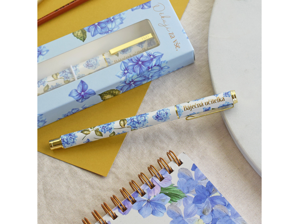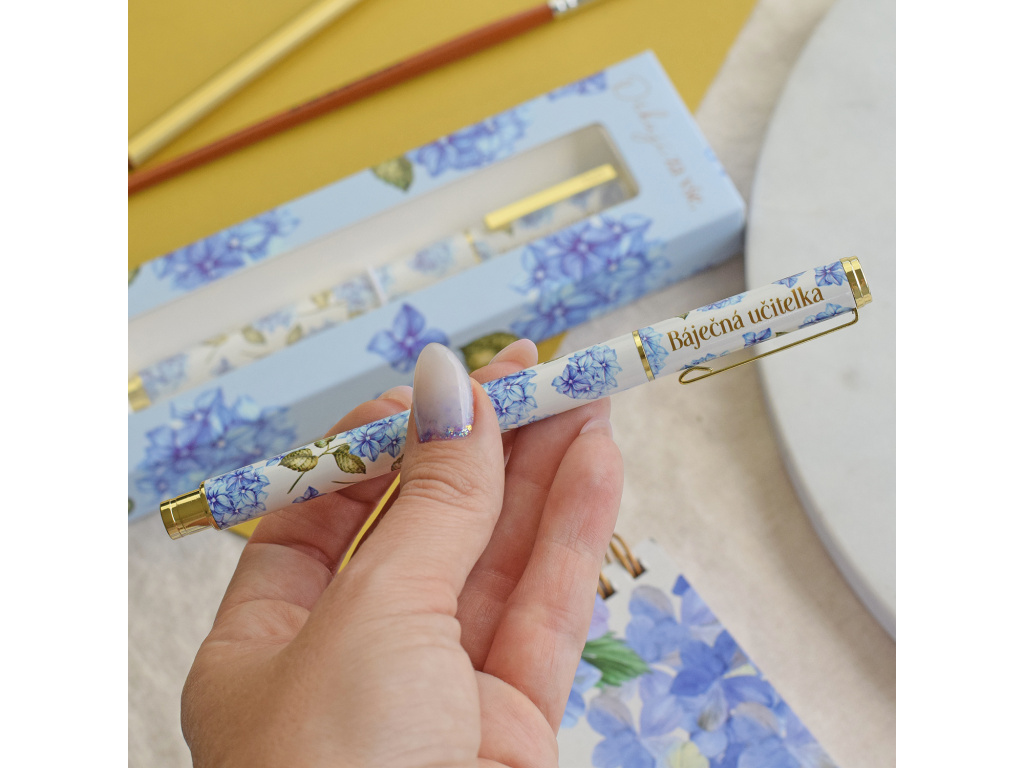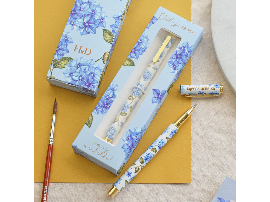 Tímto perem jsme naprosto unešení! Krásně se s ním píše, má černý inkoust, tenkou linku a náplň se může kdykoliv vyměnit. Motiv modré hortenzie je velmi oblíbený a zdobí nejen pero, ale i celou dárkovou krabičku.