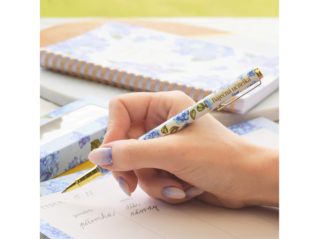 Nádherné kuličkové pero, které je zpracováno v nejvyšší kvalitě s dárkovou krabičkou a českým vzkazem pro paní učitelky. Toto celokovové pero s motivem hortenzie je jistě ten nejúžasnější dárek, který můžete paní učitelce ke konci školního roku věnovat!