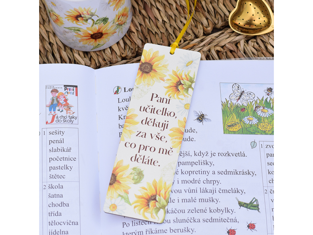 Dřevěná záložka do knížky s motivem slunečnice je praktickým doplňkem a krásným dárkem, ze kterého bude mít paní učitelka radost.