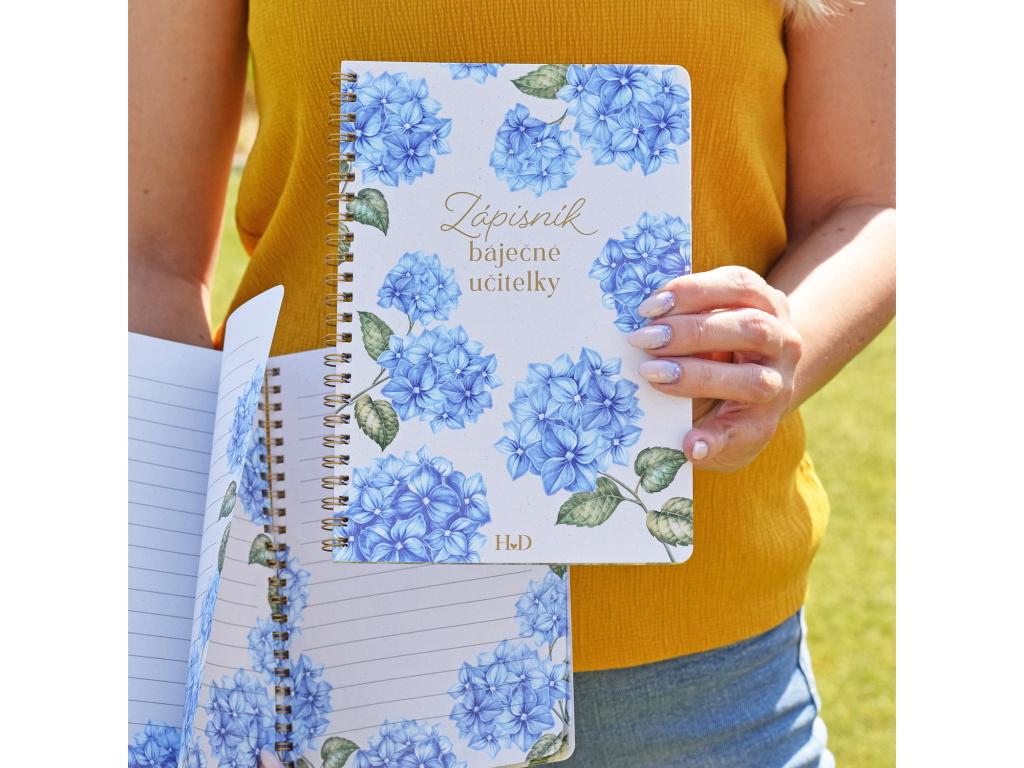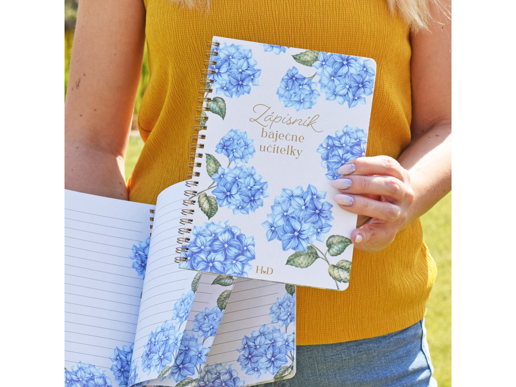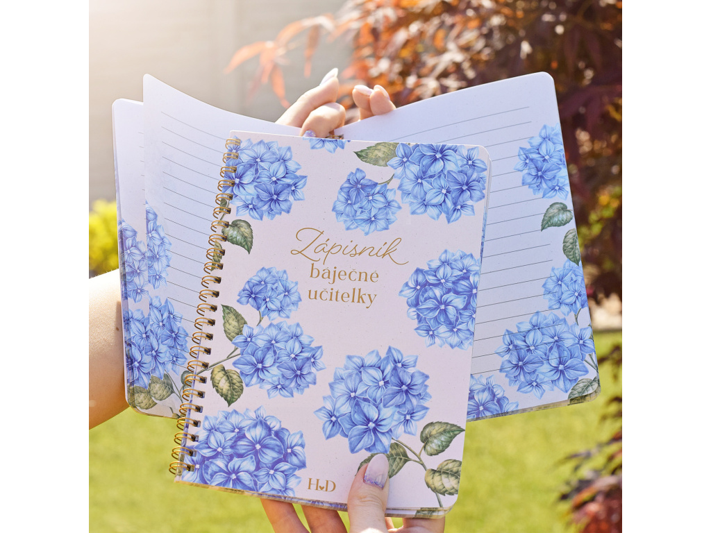 Představujeme dárek, po kterém touží každá paní učitelka! Tento barevný zápisník s motivem modré hortenzie je úžasným doplňkem, který vaše paní učitelka nedá z ruky.