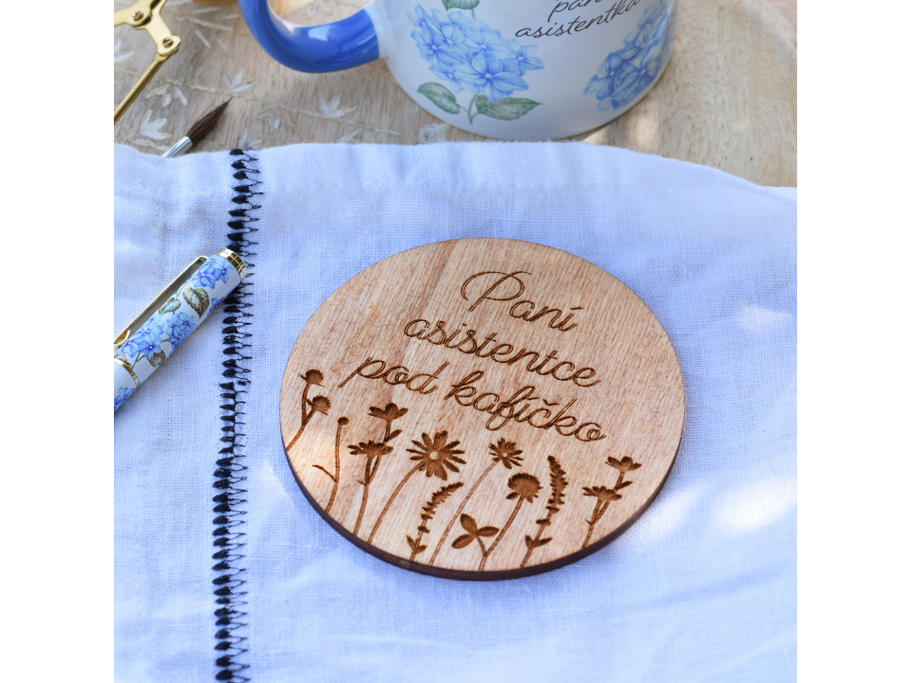 Dřevěný podtácek s gravírovaným motivem pro paní asistentku. Originální doplněk k hrnečku, který jistě potěší.