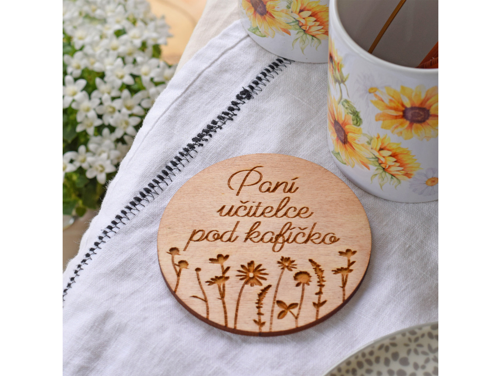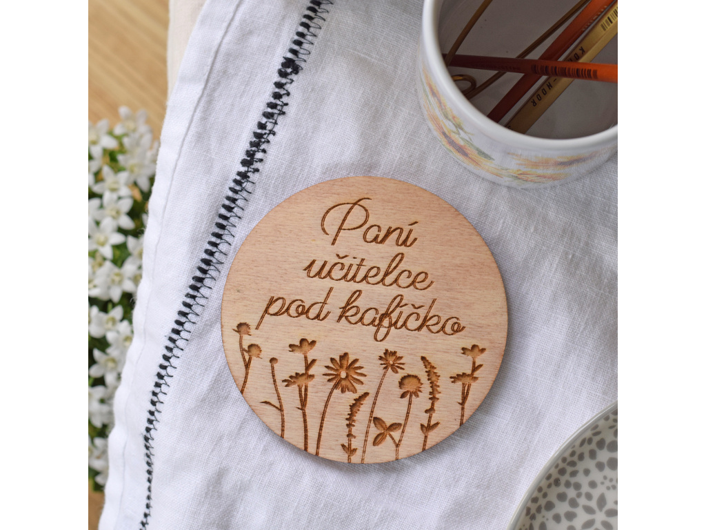 Dřevěný podtácek s gravírovaným motivem pro paní učitelku. Originální doplněk k hrnečku, který jistě potěší.