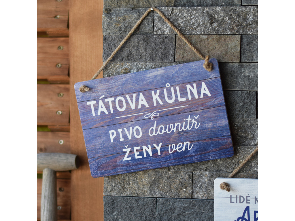 Dřevěná cedule pro tatínky - Tátova kůlna Kolekci dřevěných cedulek jsme věnovali tatínkům, kteří disponují humorem! Pokud se váš tatínek nebo třeba i dědeček zašívá pravidelně do své kůlny, jistě ocení tuto cedulku! Jak už to tak bývá, rád si osamotě nebo s přáteli vychutná své oblíbené pivo. V tuto chvíli je vždy lepší, když ženy nejsou poblíž. :) velikost: 27 x 18 cm