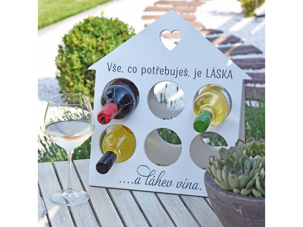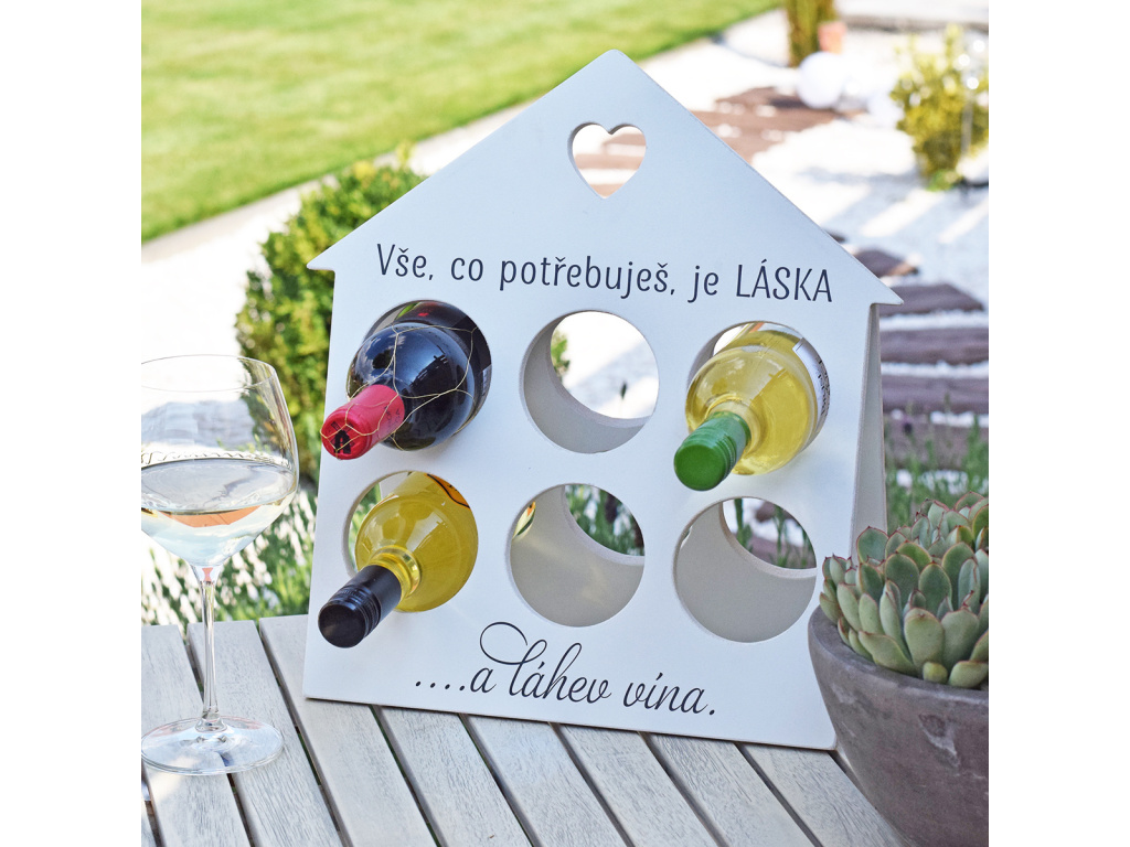 Pro milovníky vína tu máme specialitu. Dřevěný držák na víno. Jedinečný doplněk do interiéru s patřičným citátem. Díky kovovému pantu se dá složit. Je jištěn kovovým hákem.