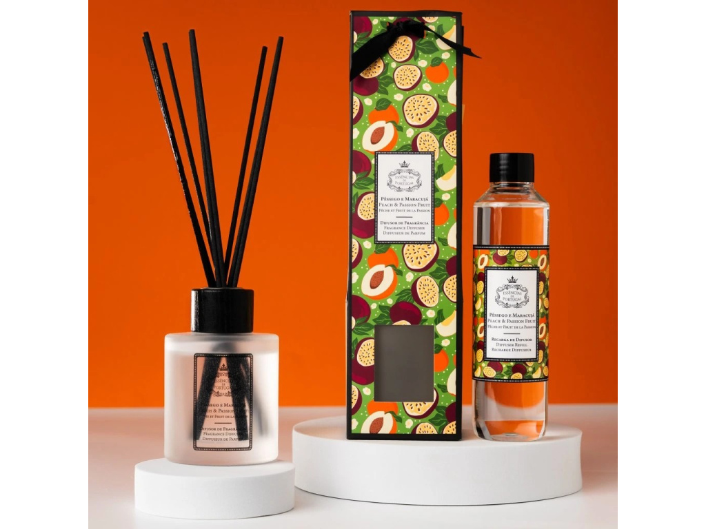 Ponořte svůj domov do neodolatelného čichového potěšení s aroma difuzérem Essencias de Portugal! Kombinace šťavnaté vůně sluncem prohřátých broskví vyvažují svěží, kyselé tóny maracuji s výsledkem exotické a povzbuzující exploze vonných esencí, které se budou rozléhat celým interiérem.