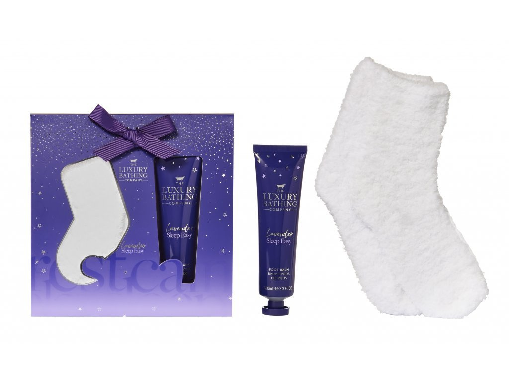 Dárková sada obsahuje balzám na nohy s esenciálním olejem z levandule pro zklidnění a uvolnění mysli, spolu s měkoučkými bílými ponožkami.