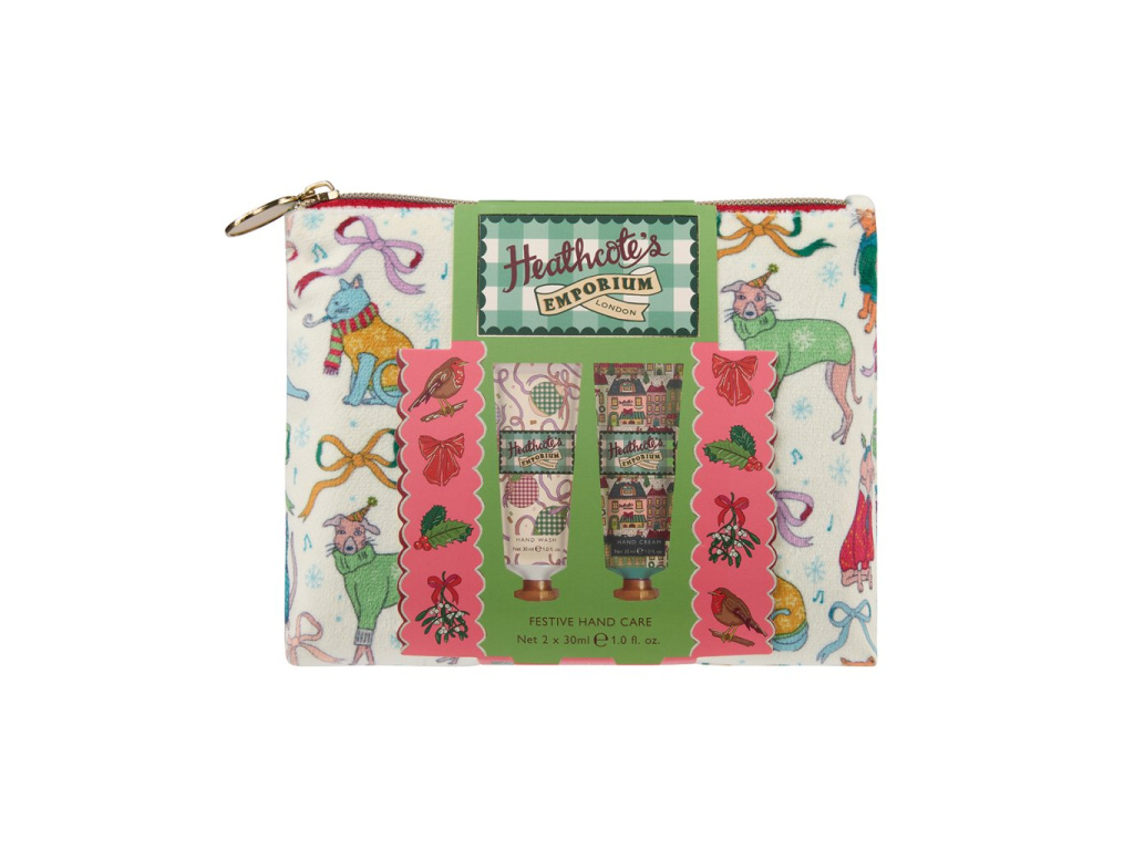 Dopřejte si sváteční péči o ruce s dárkovou sadou Heathcote’s Emporium, která obsahuje jemný mycí gel a sametově hebký krém na ruce v praktické taštičce se zipem. Taštička je zdobena hravými ilustracemi a nese vánoční atmosféru inspirovanou nostalgickými tradicemi. Oba produkty provoní pokožku uklidňující vůní eukalyptu, levandule a pačuli, doplněnou o svěží tóny zelených listů, konvalinky a hřejivého santalového dřeva.